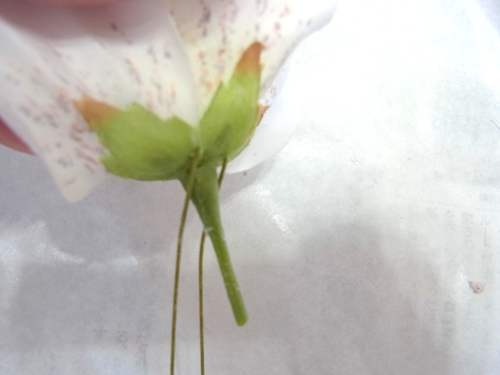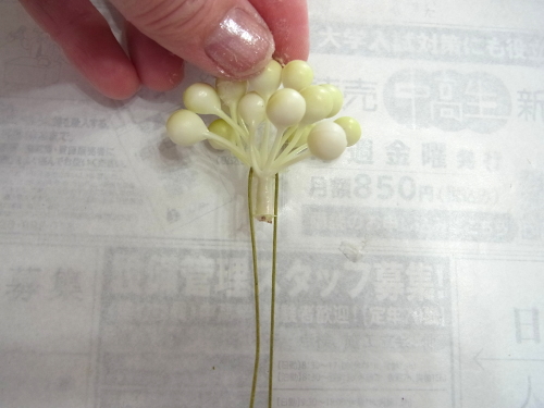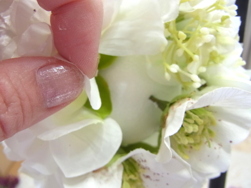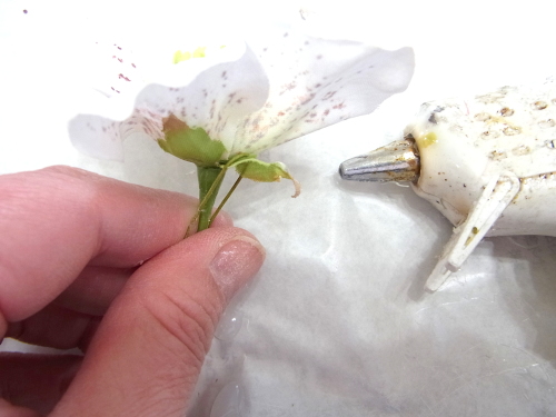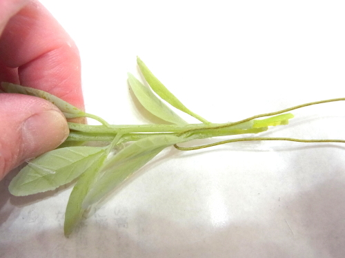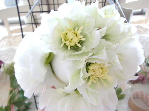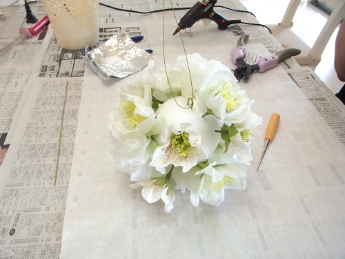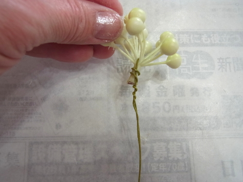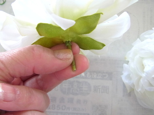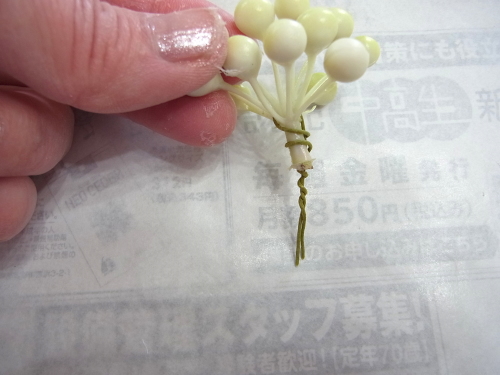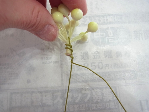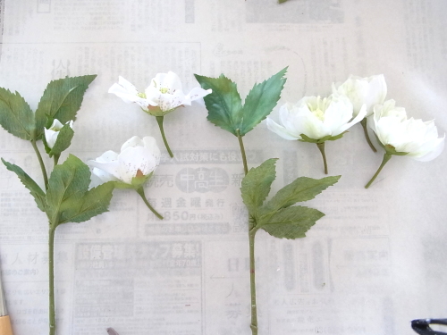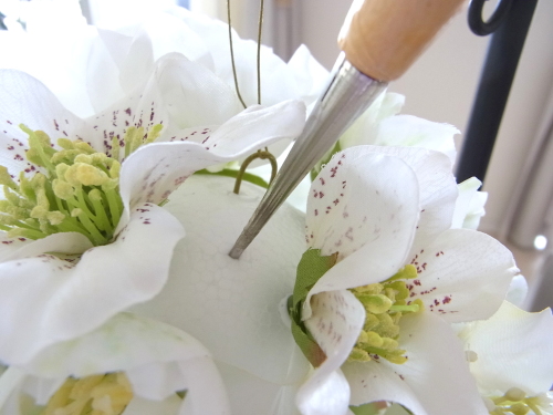 下の写真は短いクリスマスローズに茎をつくっているところです。ワイヤリングはいろいろありますので、御自身のやりやすい方法でOKです