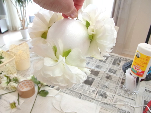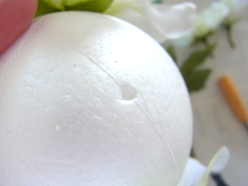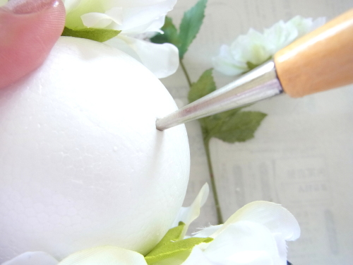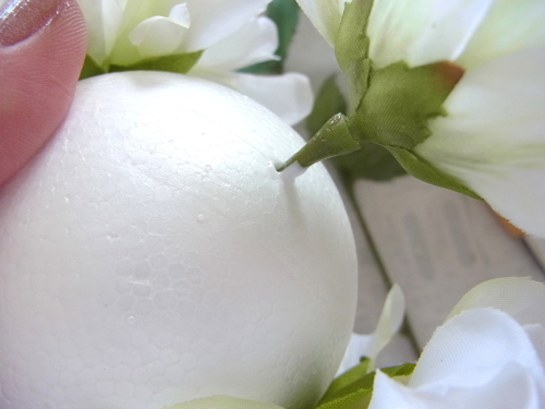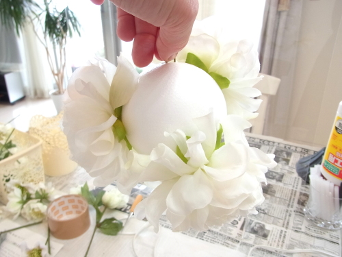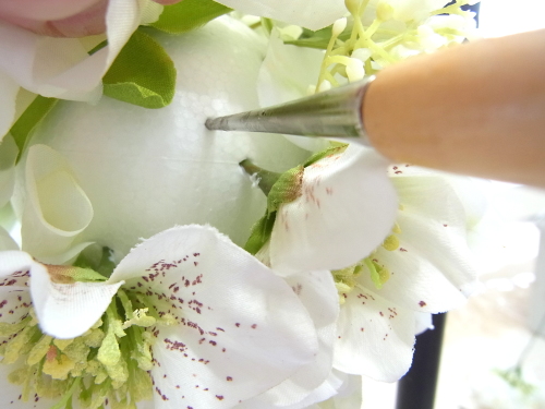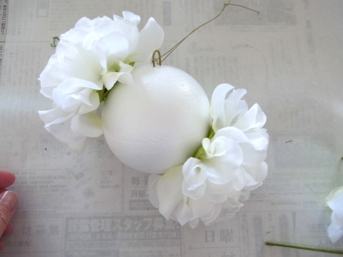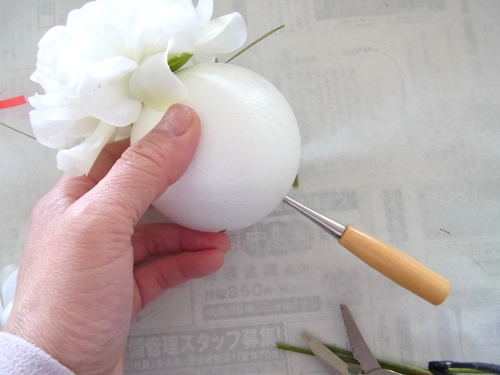 行き止まりになるまで、しっかり奥まで差し込みます。この花が一番高さがあり、この花の高さにあわせて球を描きます。 |