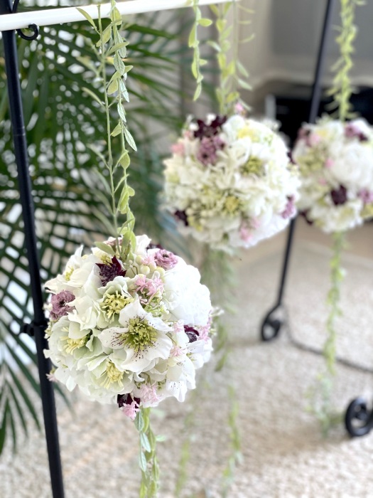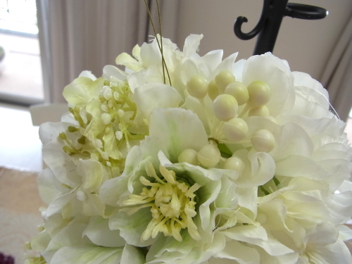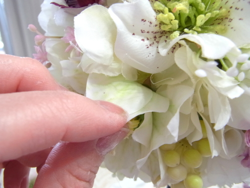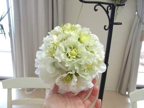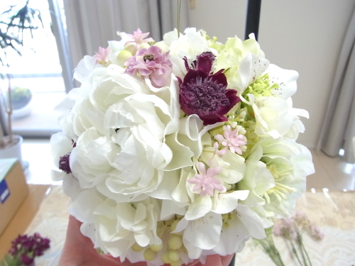 クリスマスローズが開いて入ったところで、ブーケになっていた紫陽花を小分けにします。
