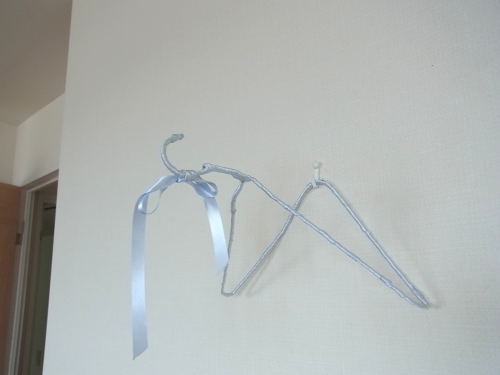 教室ではこのようにハンガーをつかってレッスンしました。後半になると、やはり下げてみないとバランスが見えません