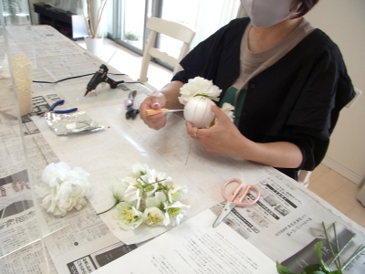 ブーケになっている大輪のラナンキュラスを3輪ヲ持ち手は短めにカットします。 |