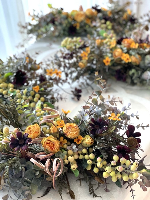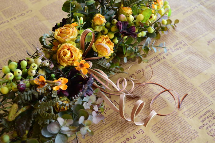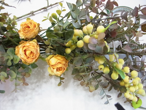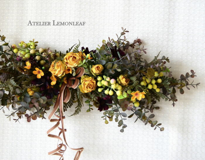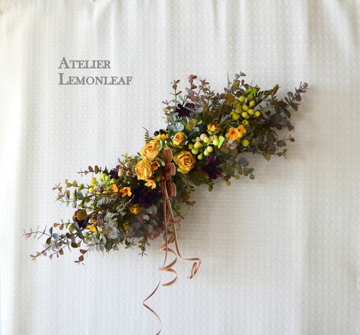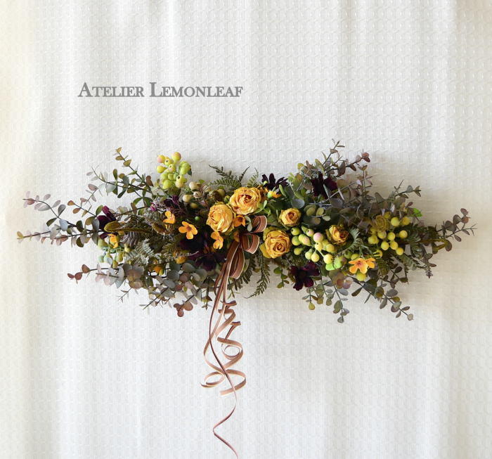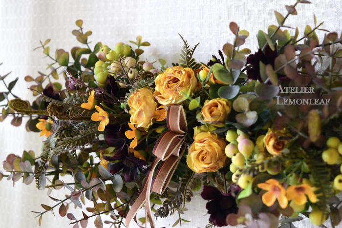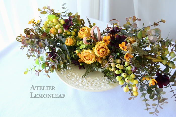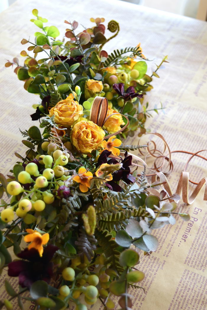 さて、今日の主役は収穫ベリー!見事なグラデーションと質感が素晴らしいアーティフィシャルフラワーです、そして、チョコレートコスモスは大人気。引き締めカラーの役割も果たしてくれています。