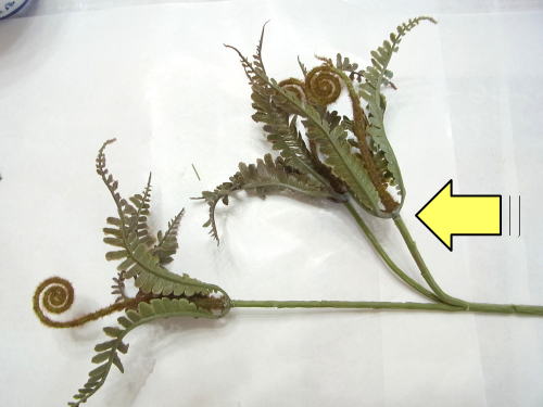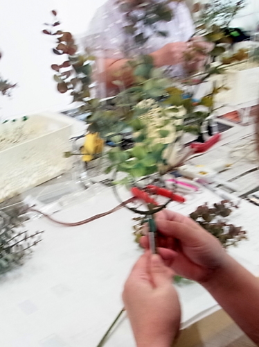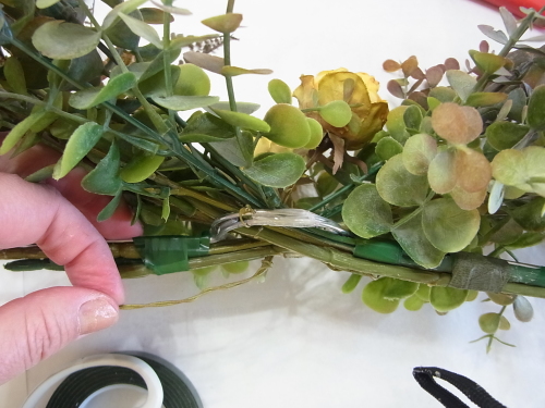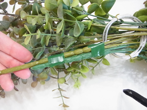 ユーカリ同様に、輪をぐぐらせ、でてきたところで、茎にテープでまきます |