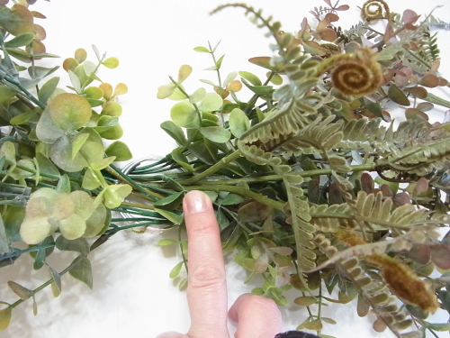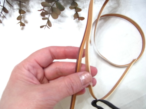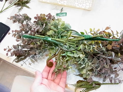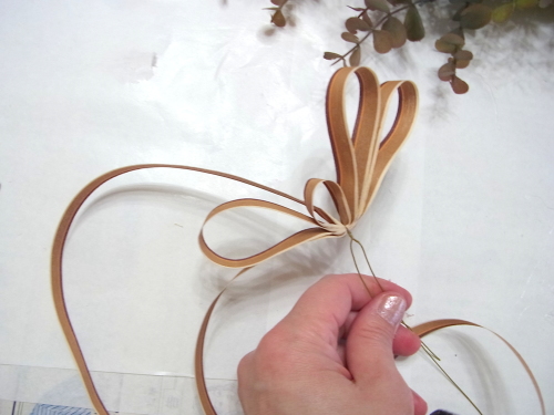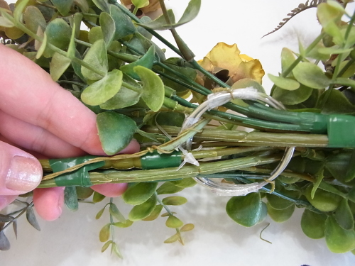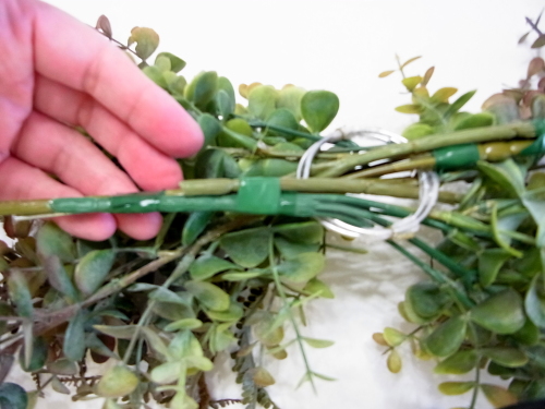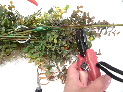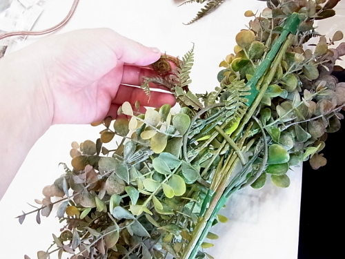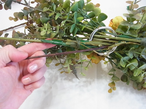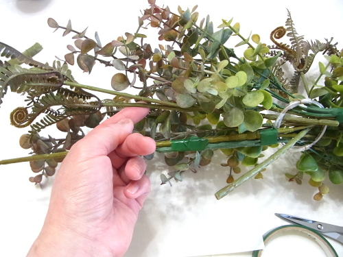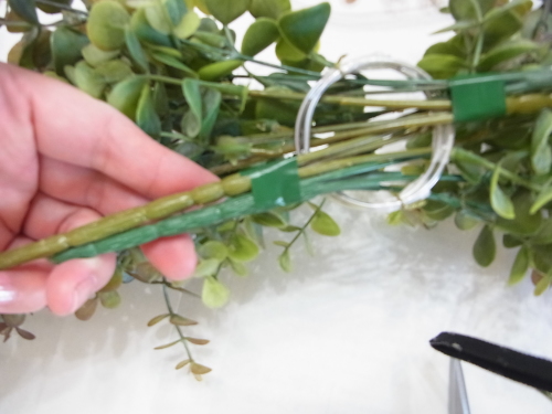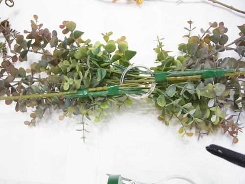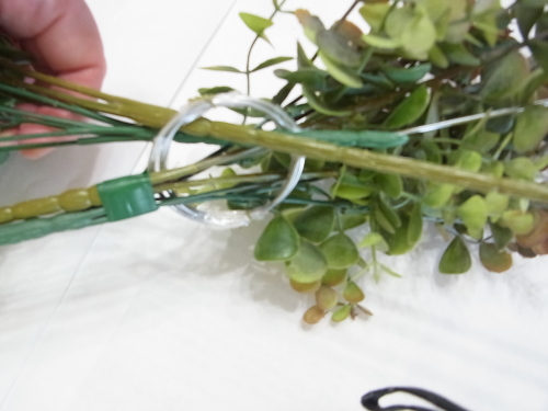長いユーカリを二本、持ち手にとめつけたら、短いユーカリも同じように長いユーカリの脇からリングにいれます。