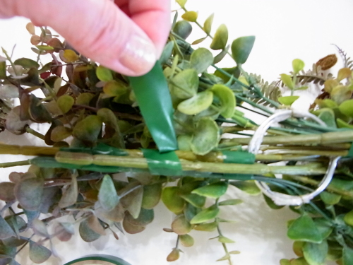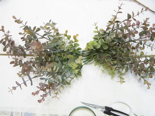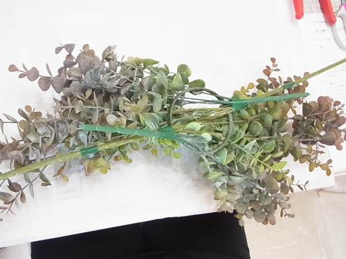 短い丈のユーカリの茎も 二か所で巻きましょう |