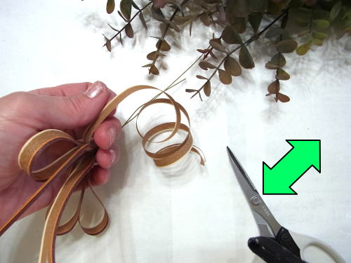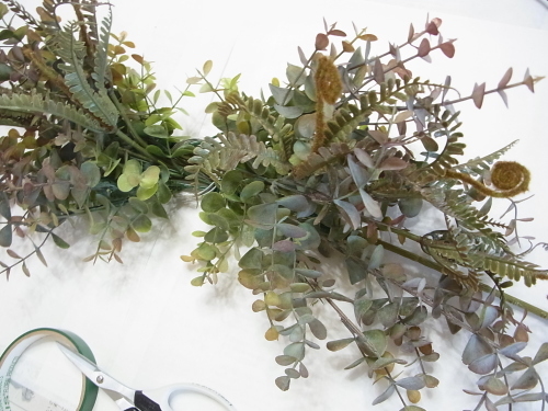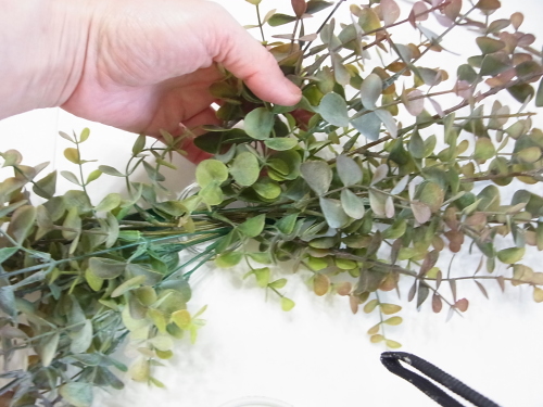 長いユーカリの茎は、一旦、リングの持ち手と同じ長さにカットしたほうが作業がしやすくなります。 |