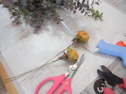 フローラルテープはグルーやビニールテープとあまり相性がよくないのです。一旦ついても、あとで、とれてしまいます