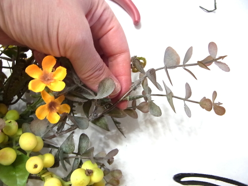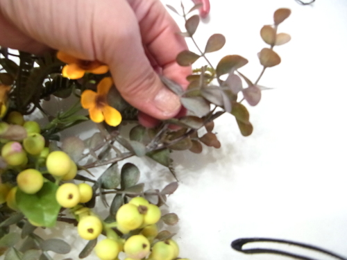 中央の好きな位置ににさし、7~8センチの高さにします、ユーカリとのバランスをみてください。