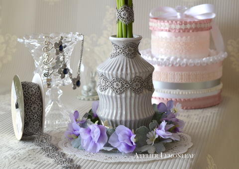 徳利のように、面白い形ですよね。こうして、おしゃれなリボンをそえるだけで、なんともエレガントな表情に変わりました。