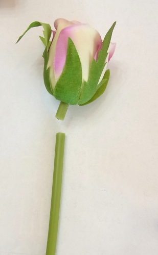 バラを写真のように、一センチ程度にカット茎をあとで利用しますので、できるだけ長くとっておきたいです。 カットすると キャップのように 茎のビニールが外れます。