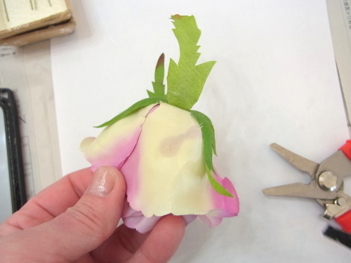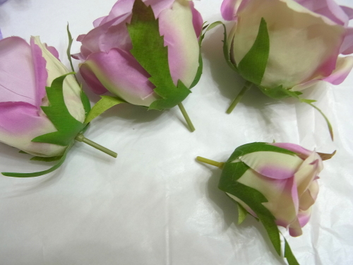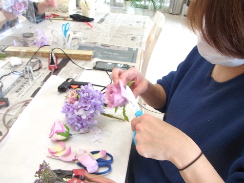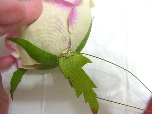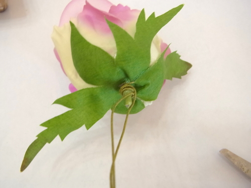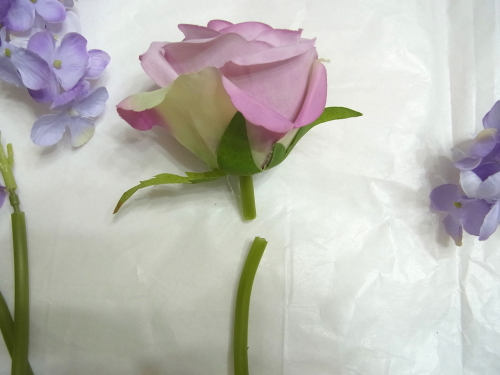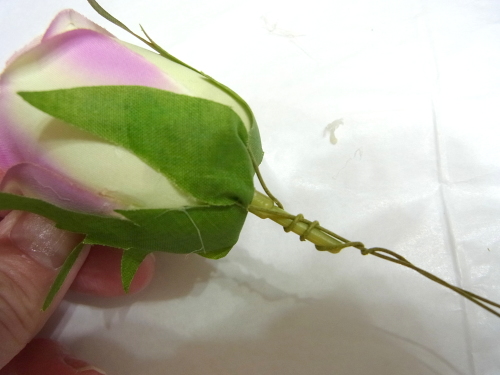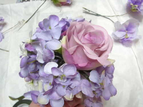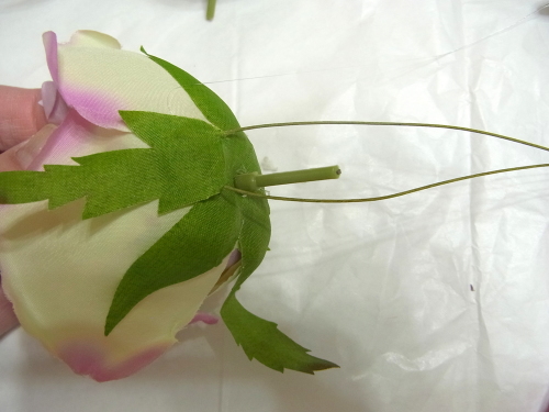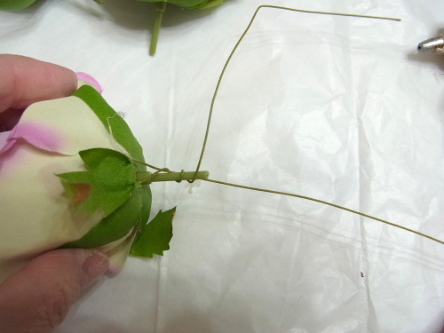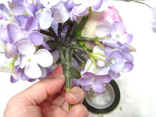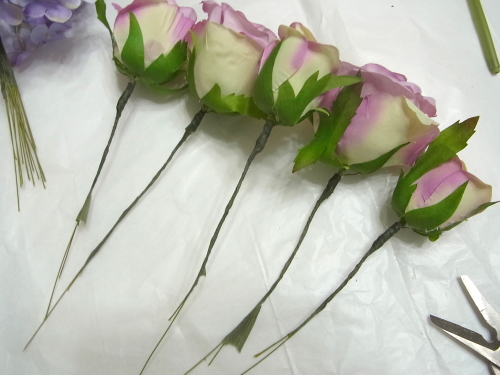 (1) アジサイ2輪づつ とスイートピー2輪づつをワイヤリングとテーピングします。バラはガクをめくってワイヤリングとテーピング。