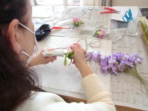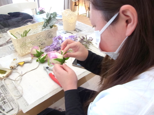 のこったリーフや、スイートピーは、自由工作してみましょう。添える花束でもいいですし、写真のように輪にしてもかわいいです。