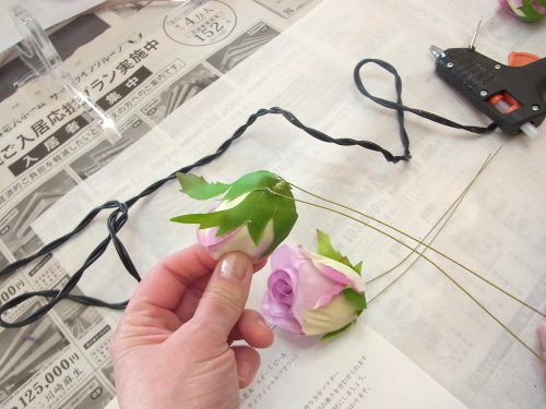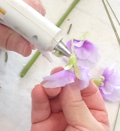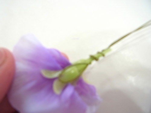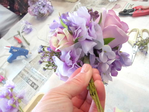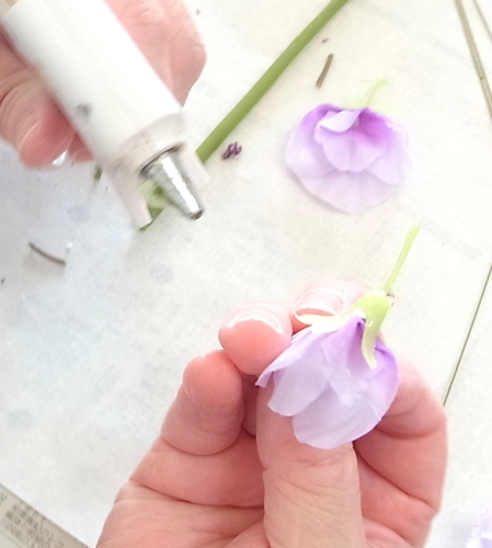 スイートピーは、 茎が抜けやすいので先に、グルーで一滴で、留めておきます。