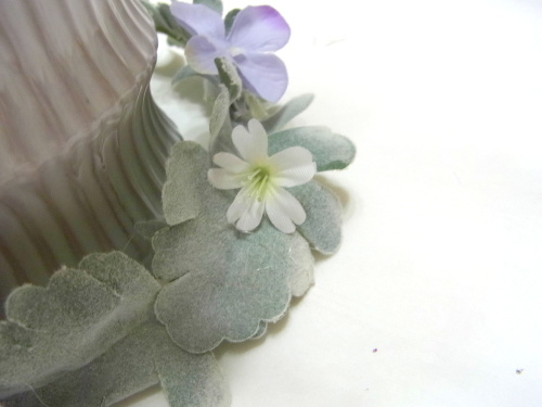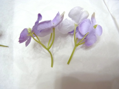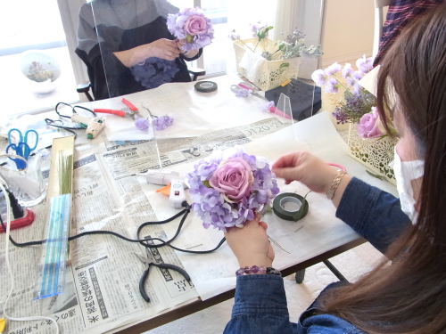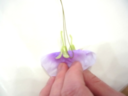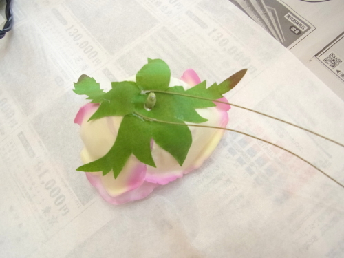 (5) 残ったスイートピーまたはアジサイを持ち手の真下の穴が隠れるように下向きのU,におり、さしこみ持ち手にとめます。
