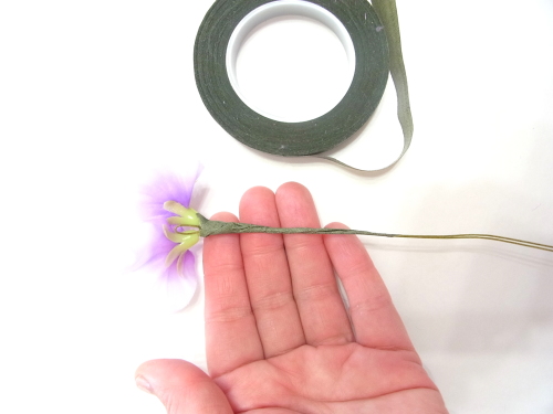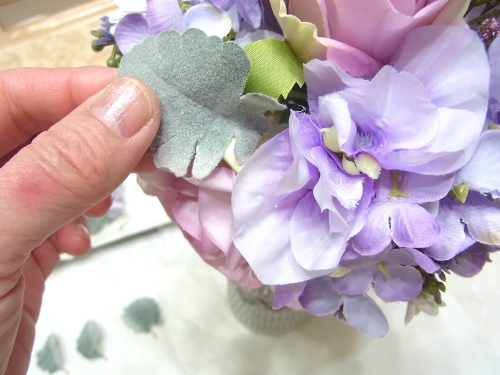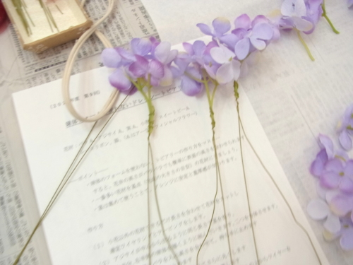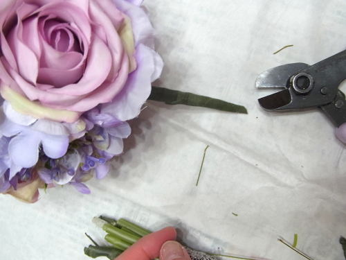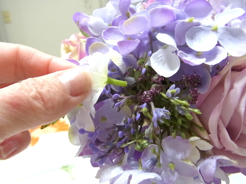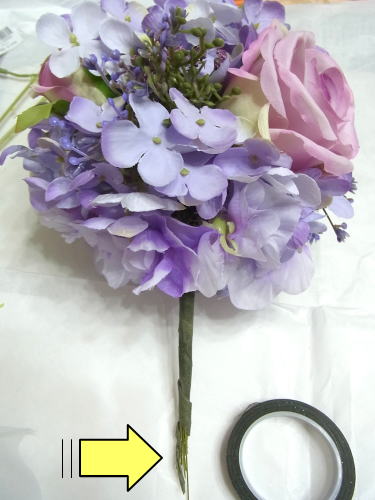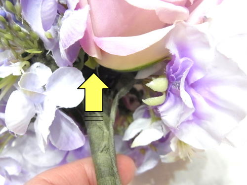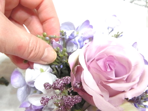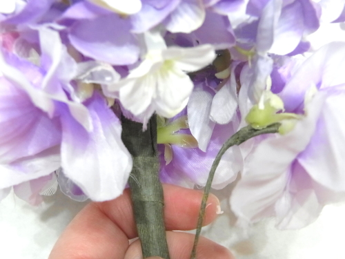 スイートピーや、アジサイの一本だけのものを急角度をつけて折り曲げて、穴がかくれる位置に添えてとめます。