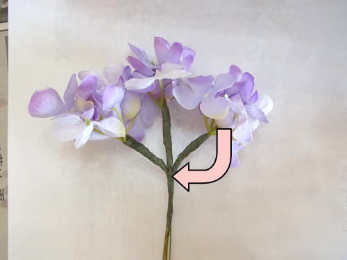 こちらもテーピングで10cmほど巻きます。 次にあじさいを、準備しましょう。あじさいを引き抜きます。 キャップのすぐ上を切り、 写真のような形にします