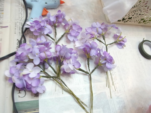 アジサイの構造上、短いものと長いものが出ますので、できるだけ同じ丈の者同士で、ワイヤリングするとスムーズです。すべてに、ワイヤリングできました。 こちらもテーピングを10cmほどします。 ここから組んでいきます。