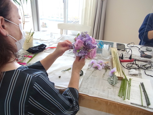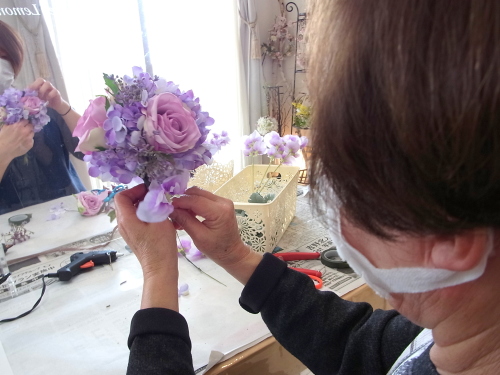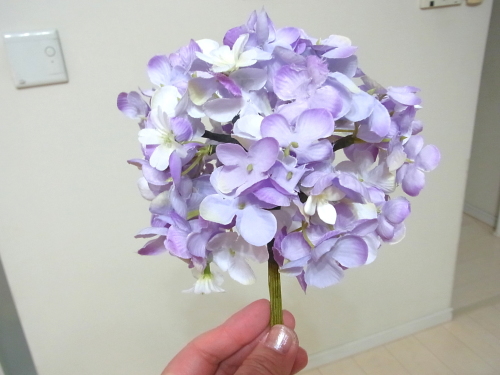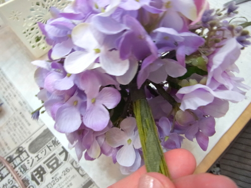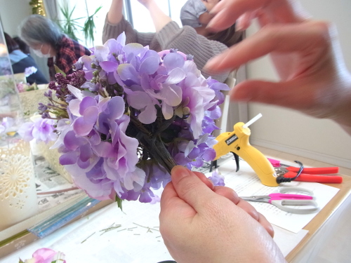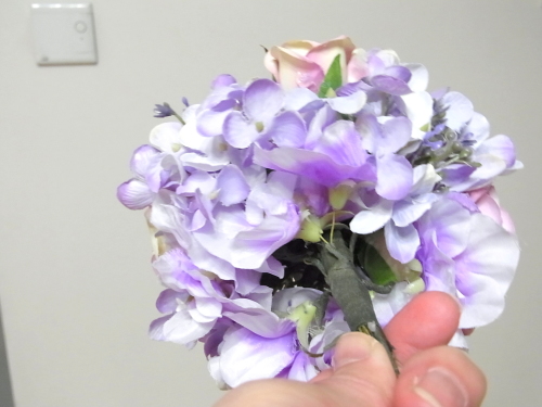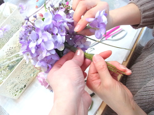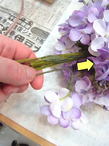 半径のステムを下げてみても、穴があいてしまう時は、残りのアジサイや、あるいはスイートピーを追加でワイヤリングして、添え、穴を隠します。手元の穴の隠し方