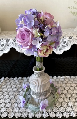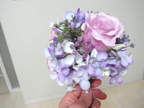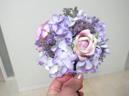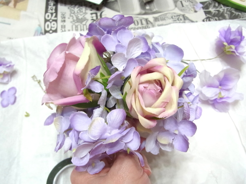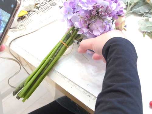 アジサイは花びらを持つと取れてしまうので。茎の部分を持って調整しましょう。手元の部分をよく下げておきましょう。 全体がほぼ、丸く整ったら、好きな位置に薔薇を挿し、球の高さを合わせて。 手元で巻きます。 バラの位置やバラの先端ので加減で、 雰囲気も変わってきます。