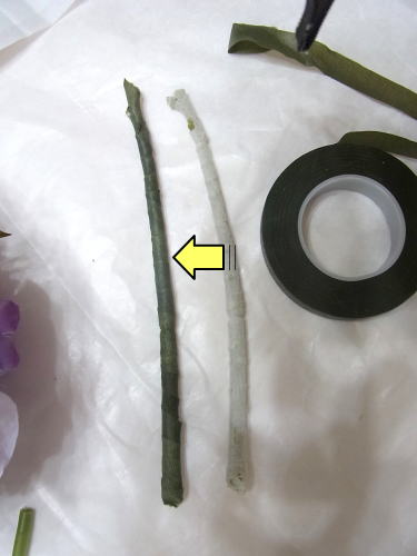 それぞれをねじかけてもOKです10センチほど、テーピングします。下までまかなくてOKです。 実はこのようにカットし 摘まメル程度に茎をそろえてカットし、 写真のようにワイヤーリングします こちらもテーピングを10cmほどします 次にスイートピーを準備しましょう。