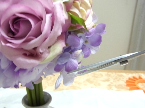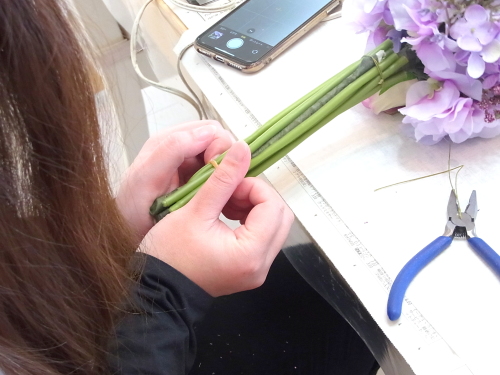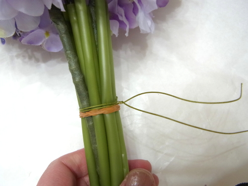 お花をできる限り、中心の根元まで差し込みます。輪ゴムは写真より、もう少し下でよいです。中心付近まで、押しこんだら、ワイヤーで茎の束の上部を縛ります。