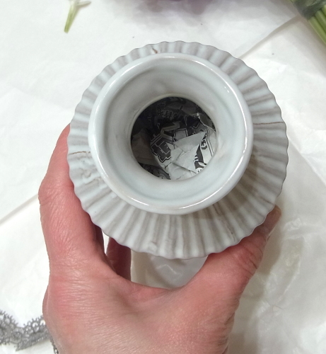 お花をさげて、ワイヤーを隠します下の方もワイヤーで束ねておきましょう 器に細長くカットした、新聞紙を器につめて好みの高さにします。