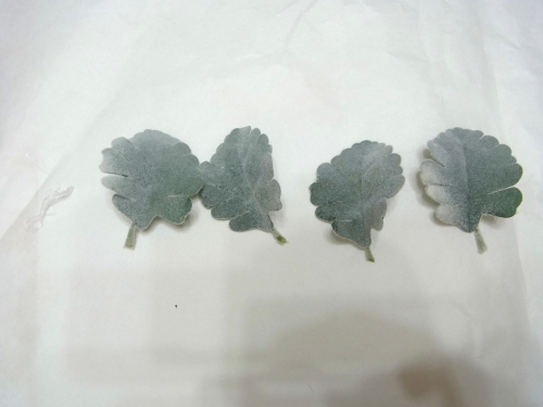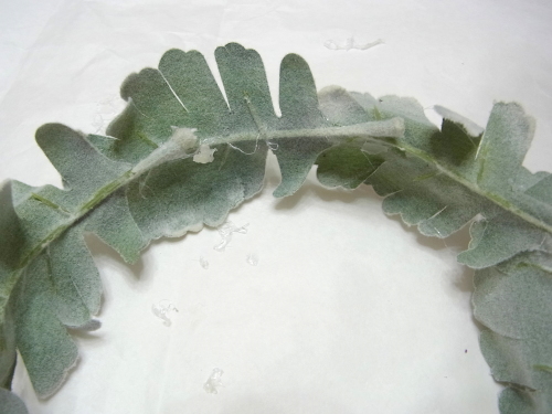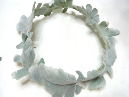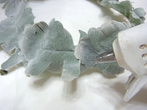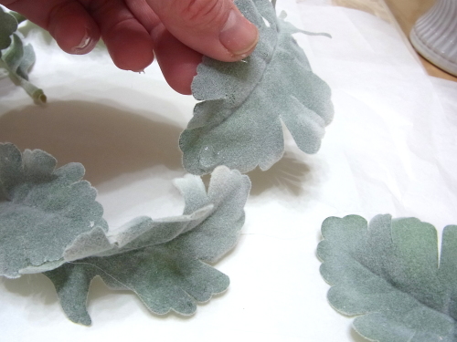 葉っぱをグルーでとめていきます。 リングをあまり大きくし過ぎないことが、かわいく見えるコツです。 残ったお花ををトッピング。 あるいは葉をトピアリーに入れ込んで、葉先をだすのも素敵です。