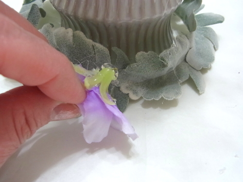 (7) 器に入れ高さを決めます。ゴムを外し、リボンの位置にワイヤーをかけてから、グルーでリボンをとめます。