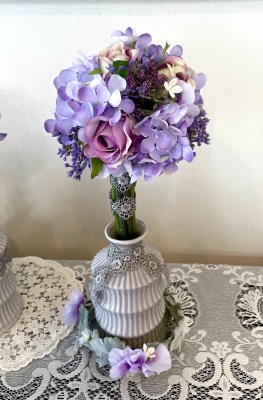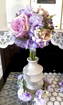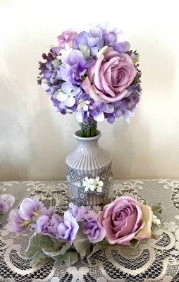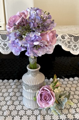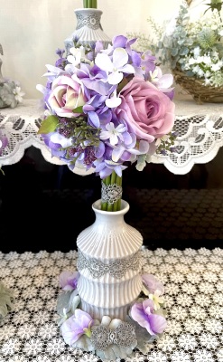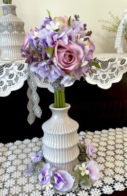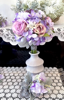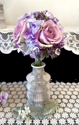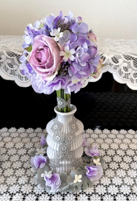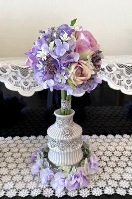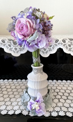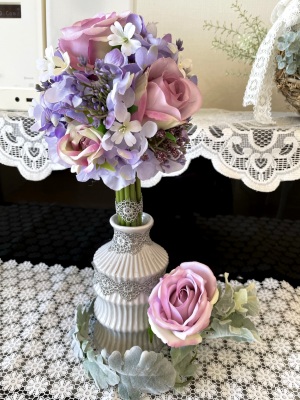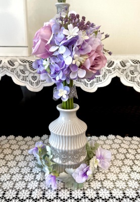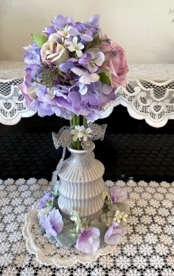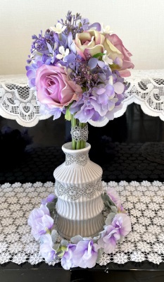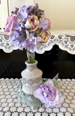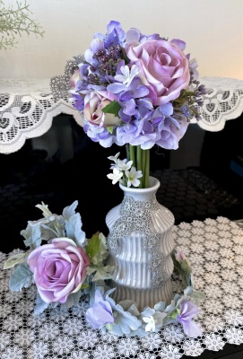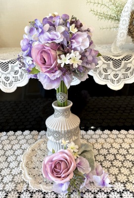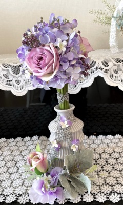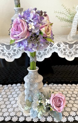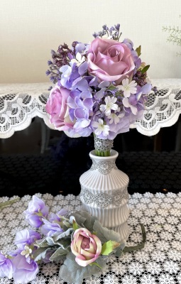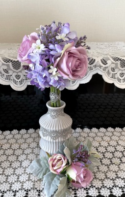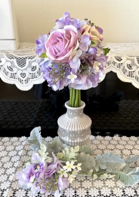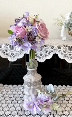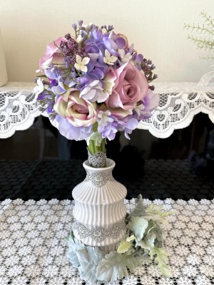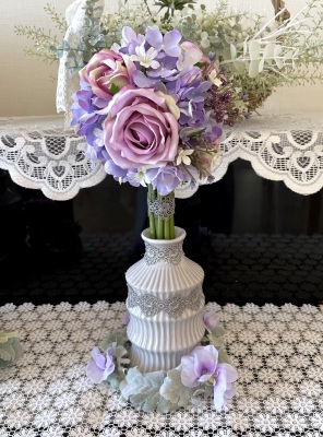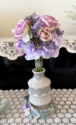 花材:バラA、アジサイA、実A、小花A スイートピーA,、レースリボン、器、(Aはアーティフィシャルフラワー)