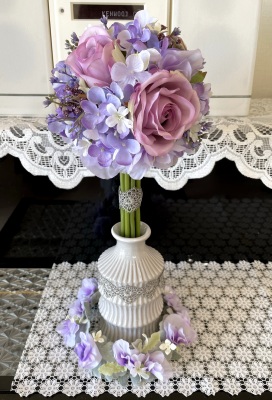 テーピングは最後に下までまかなくても、合体してあればOKです。このようになります。 3セットをひとまとめにしたものを、同じ要領でもう一つ、つくりますす。 さらに、上の写真の二つを、中心をあわせて合体させます ひとつにしました(写真はスイートピーが抜けていますが、皆さんはスイートピーも入れてあげてくださいね) 一つにしたら、丸くなるように中心から上げ下げして形を整えます。
