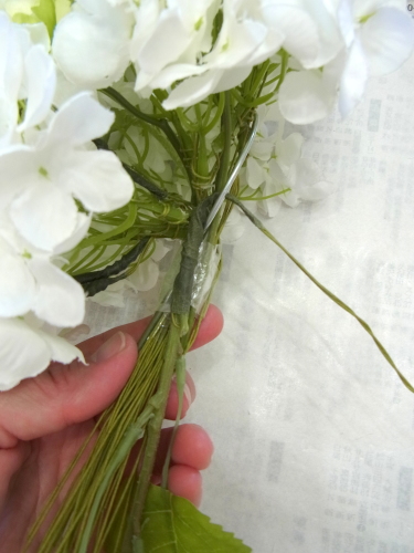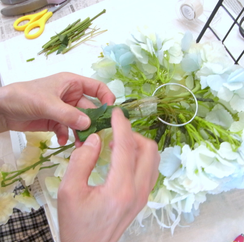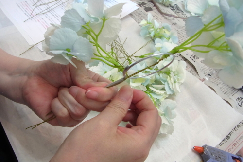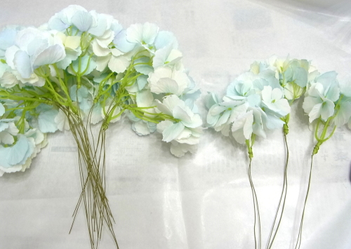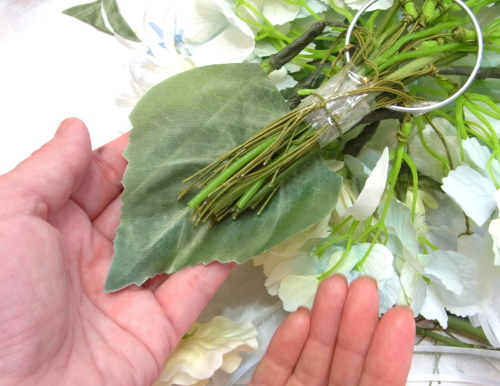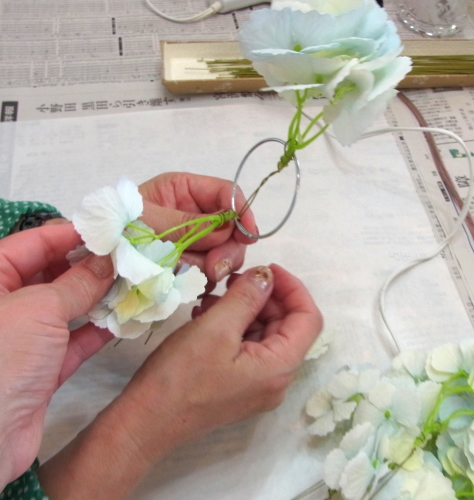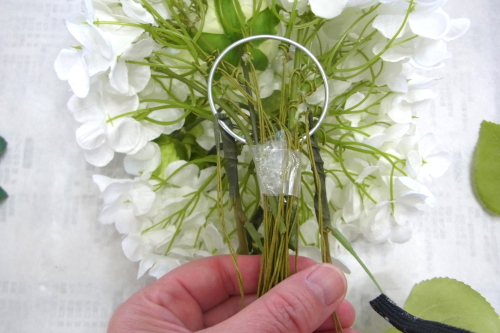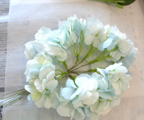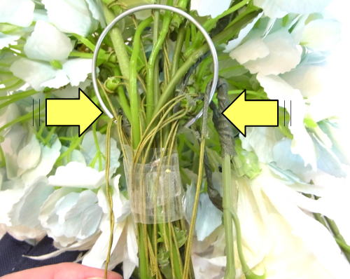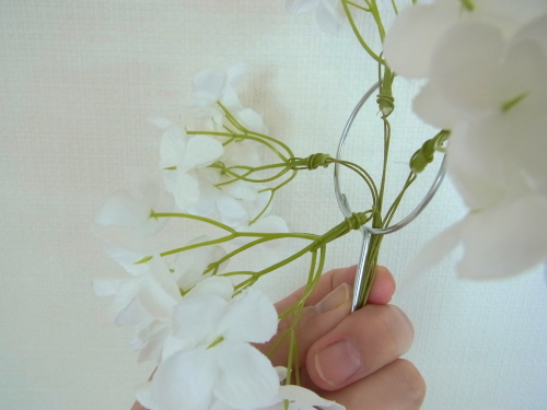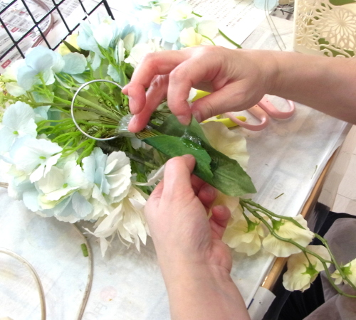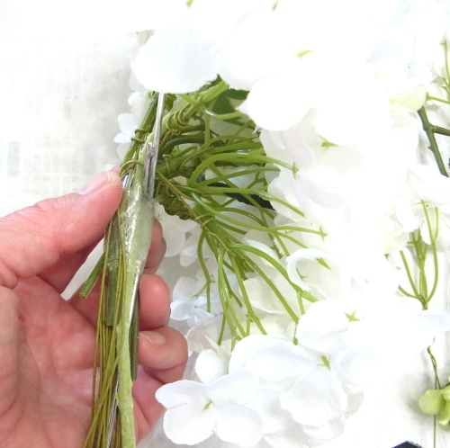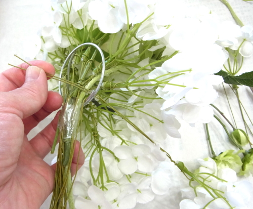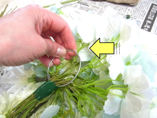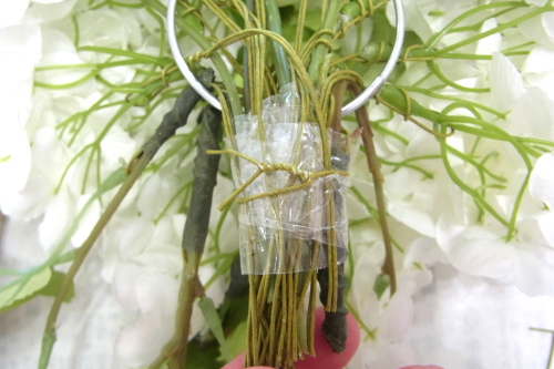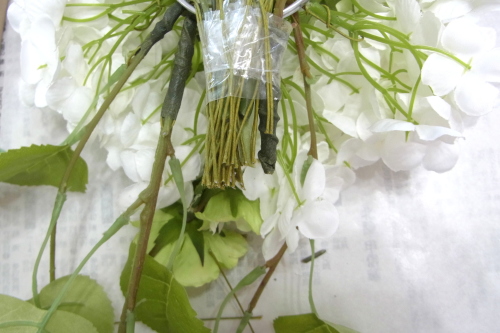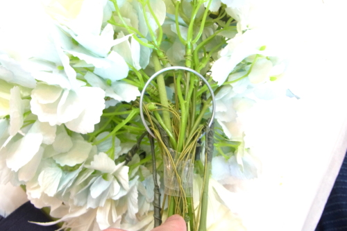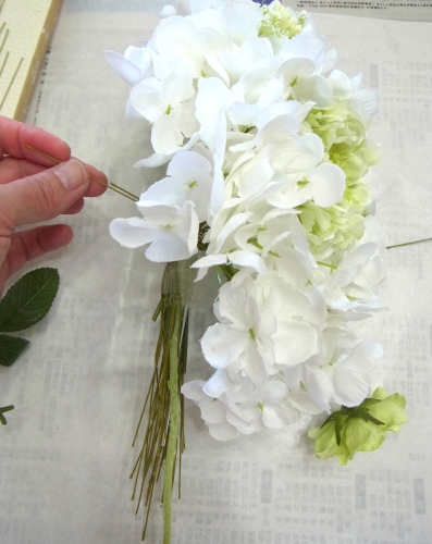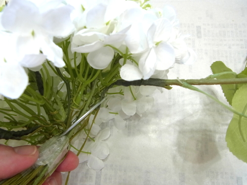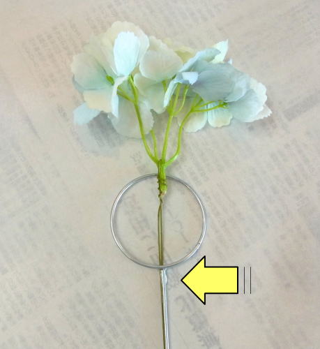 | もう一本紫陽花を挿し、こちらはワイヤーが曲がるところで、真下に向けてとめます。 | |