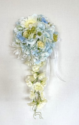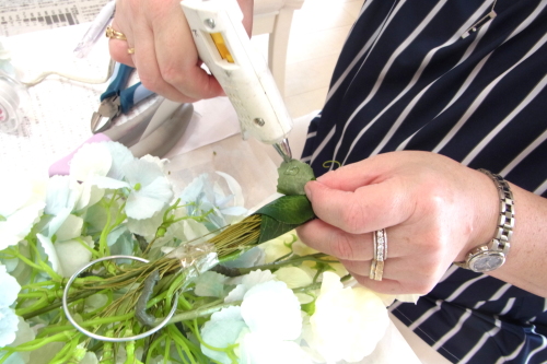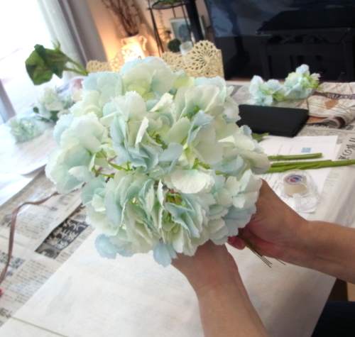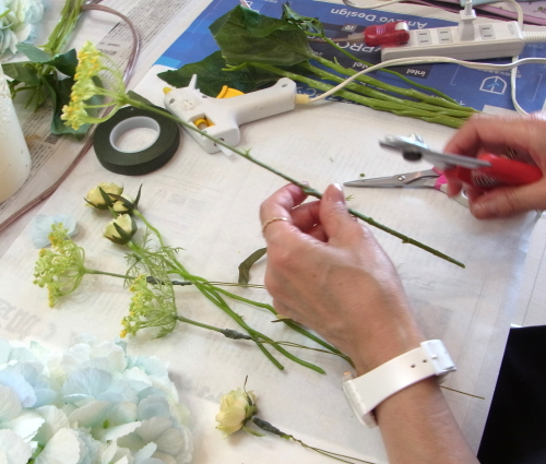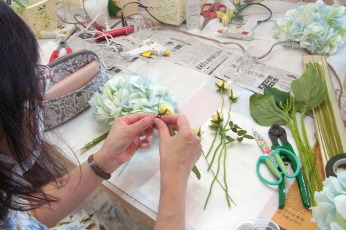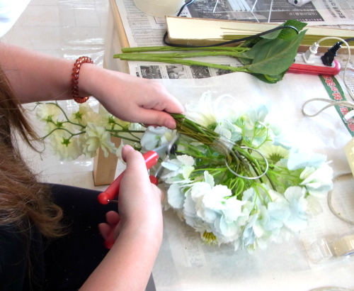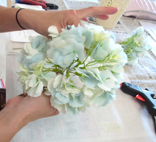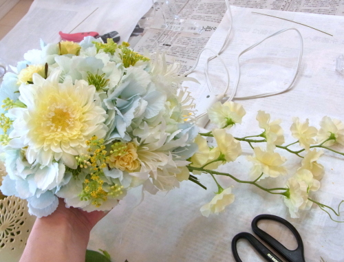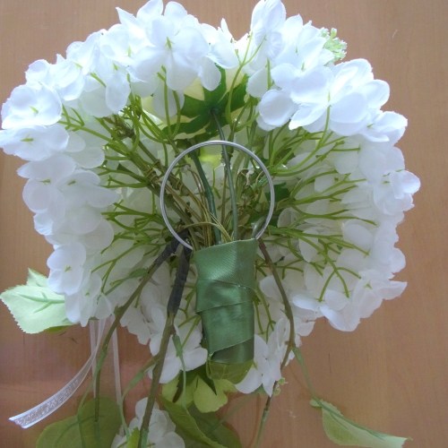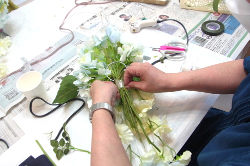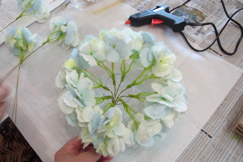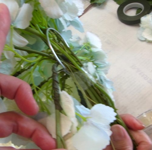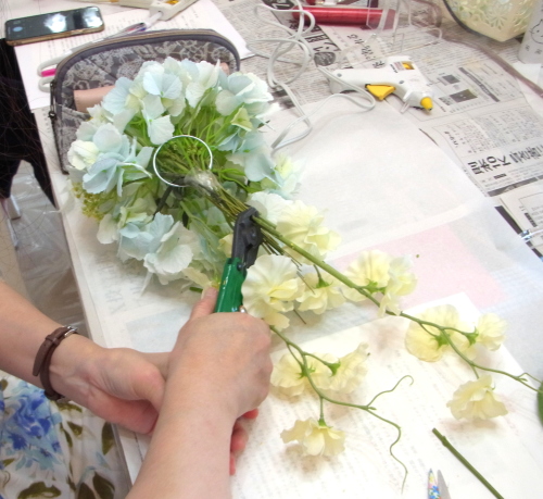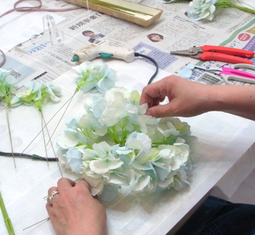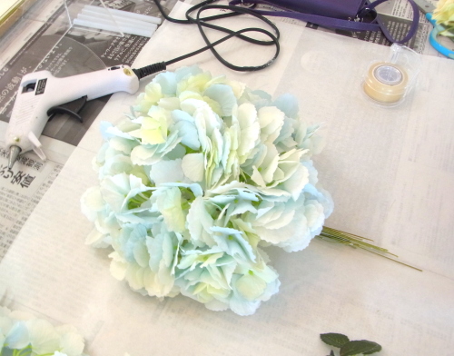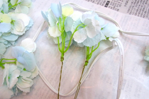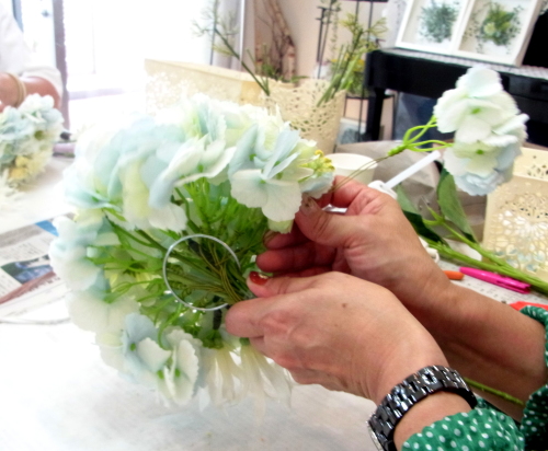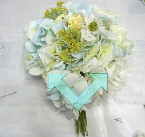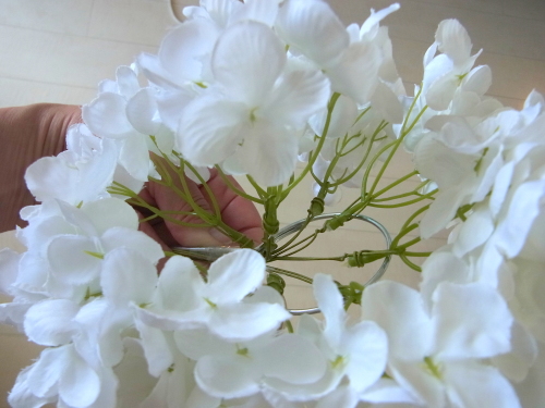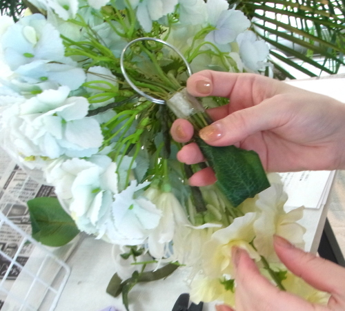 | もう一本紫陽花を挿し、こちらはワイヤーが曲がるところで、真下に向けてとめます。 | |