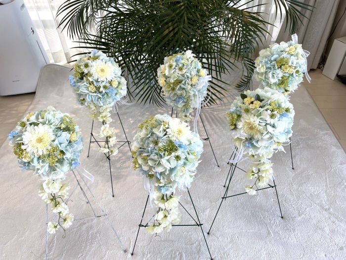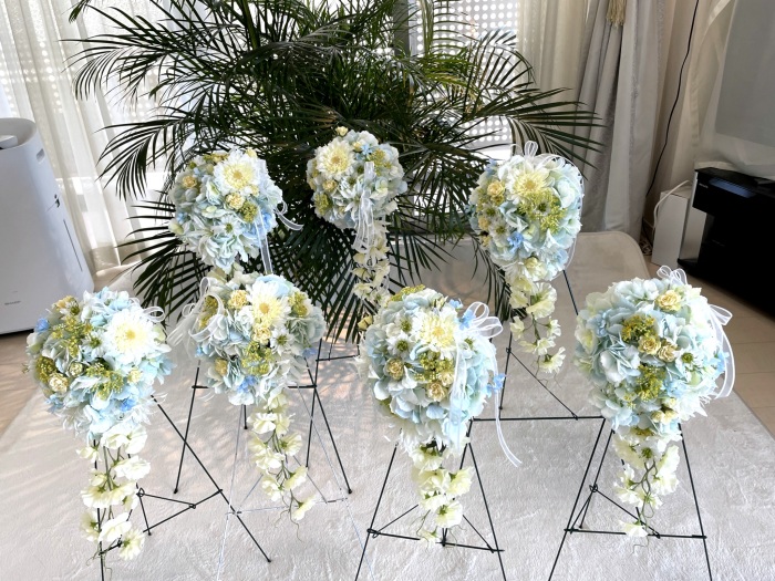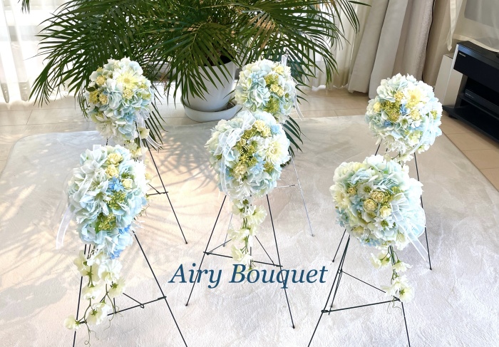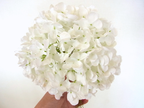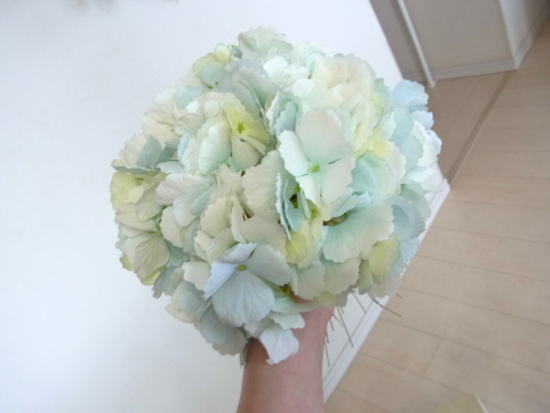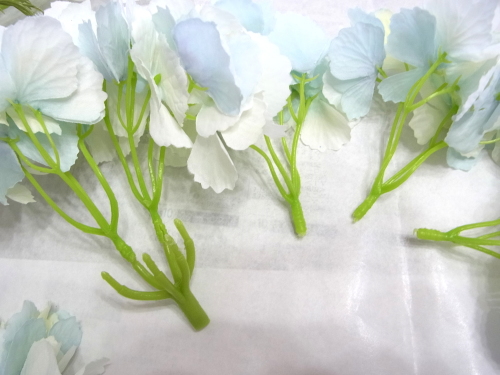 | みなさんこんにちは。 暑い日が続きますが、お元気ですか? 今月は魔法のアシストリングを使って楽々につくれるエアリー♡ブーケ(壁掛けブーケ)のご紹介です。 涼しげなカラーもとても人気!ではさっそくつくっていきましょう まずあじさいから全てのお花を写真のように引き抜きます。 一本に5 房づつついています。 よくみると、6房分軸があるのですが、ついていません。これはそういう仕様になっているもので、花取れではありませんのでご安心ください。 |