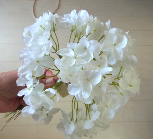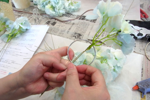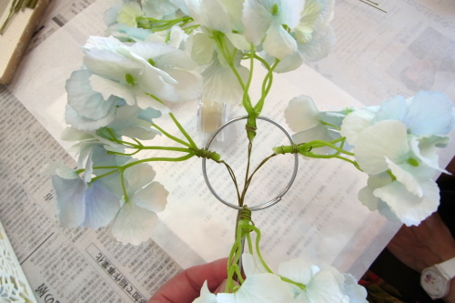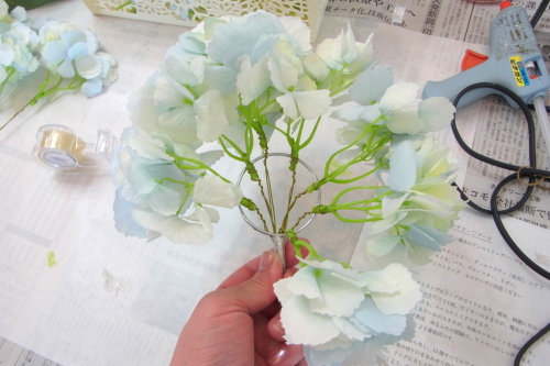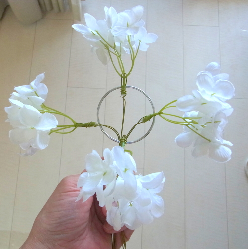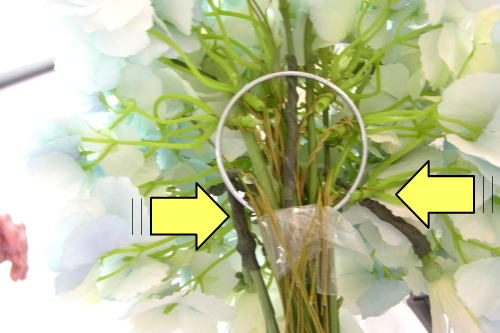 | 次に同じ要領で左右も 先の上下とあわせて東西南北になるように、すこしカーブさせた紫陽花をいれ、セロテープでとめます。 左右の位置は茎がリングに軽くかかる程度でOKです。 写真を参考になさってくださいね |