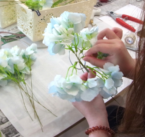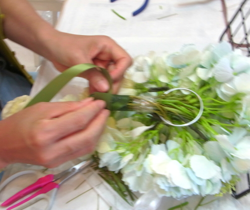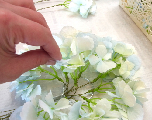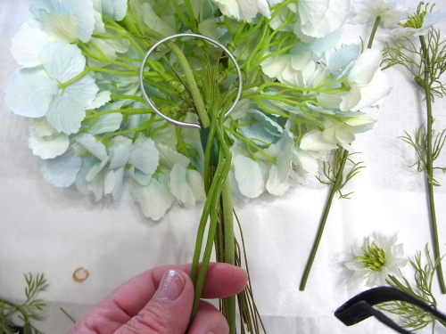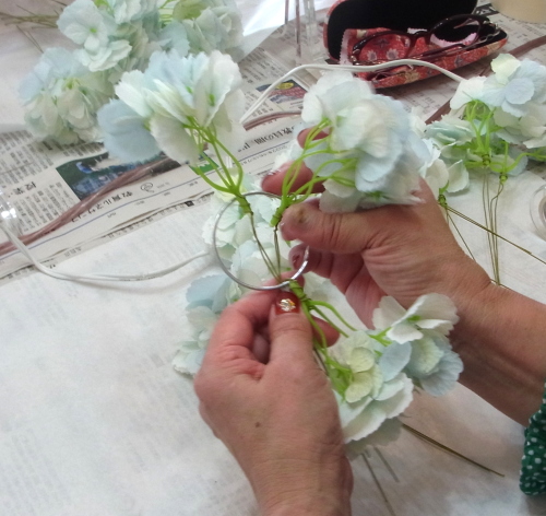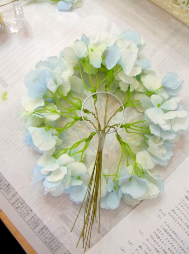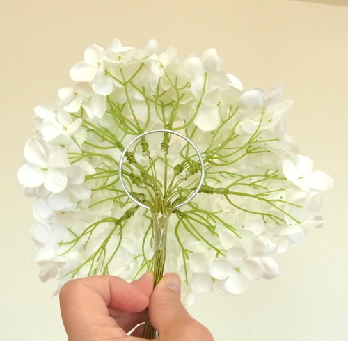 | つぎに中心(トップ)をつくります。 垂直に曲げた紫陽花を輪にとおしてとめます。 ちょうどテーブルにおいて、なだらかな半球体を描く高さにします。 |