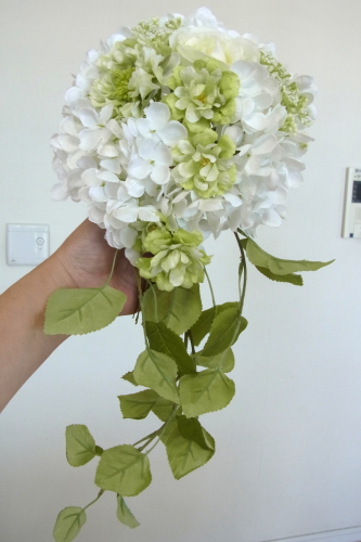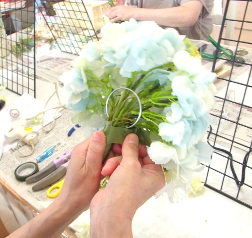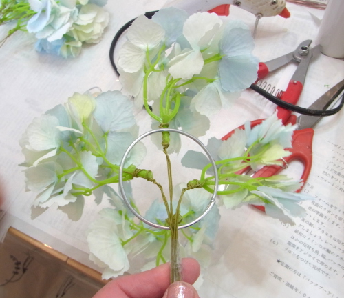 | こちらは先端の三角形をつくるために、リングの脇から紫陽花をいれているところです。 紫陽花は最初のワイヤリングのこのままですと、大きすぎるケースもあります。 先端にしてはボテっと大きい場合は間引いてつかいましょう。 紫陽花3輪全部使う必要はありません。 残ったら仕上げのシルエットの調整に使いましょう ポイント 中央はすぐ、いっぱいになりますので、そんな時はまずは、リングの空いている部分にさしてから、好きな場所にお花を寄せてもってくる方法で、大丈夫。 22番でワイヤリングすると、好きな位置にまげてキープできますので、こういうことが可能になります。 |