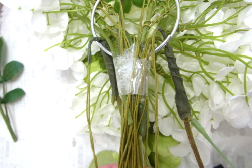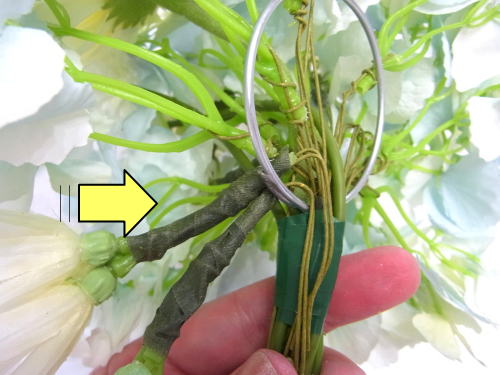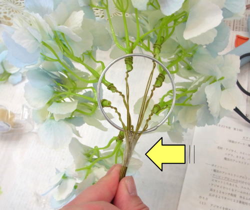 ワイヤリングした紫陽花を魔法のアシストリングに挿します。 ポイント つねに、輪の上から挿します。花材がリングにのり、アレンジの背面が支えられる器具です。 ちょうど緑の茎の硬い部分がリングの輪の上にくるようにおきます。 写真のように輪のすぐ下、持ち手のところでセロテープでとめます。 魔法のアシストリングの持ち手にはフローラルテープは不用です。あとで見えなくなりますので。 |