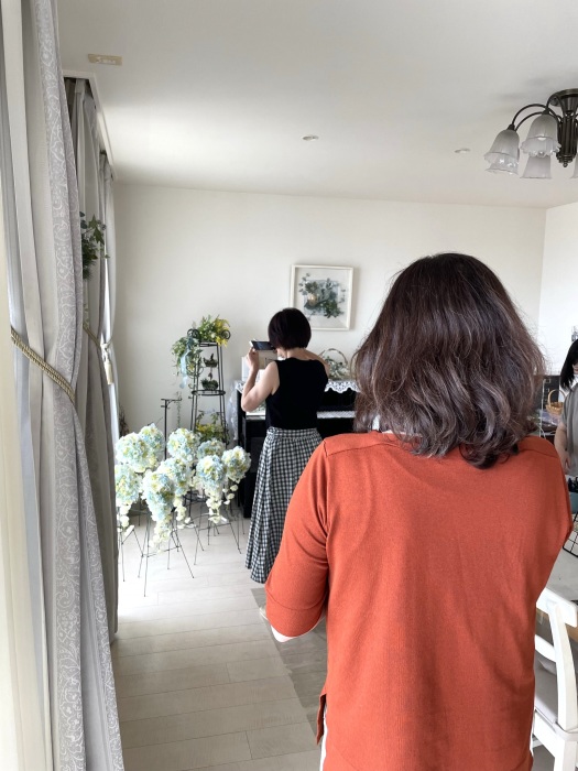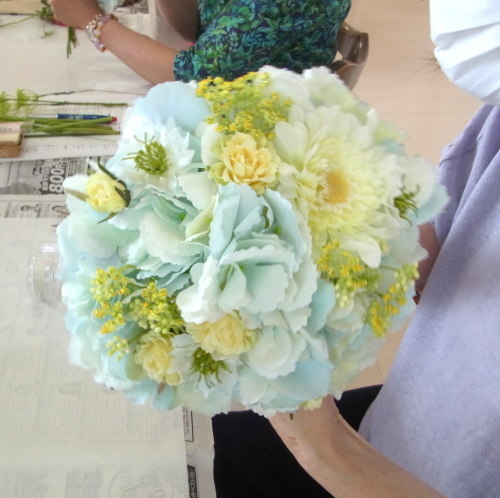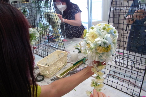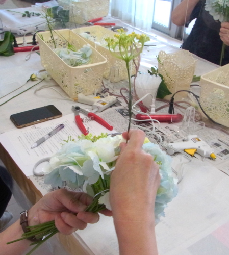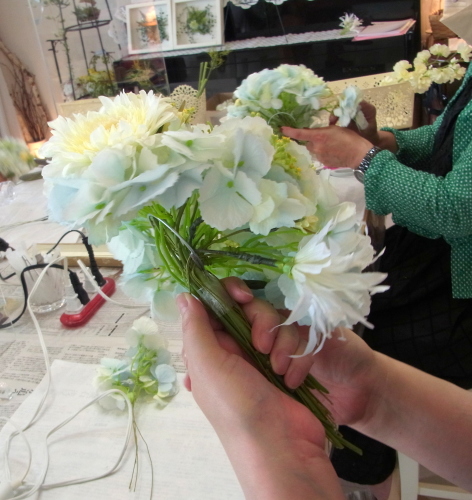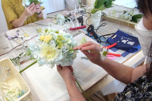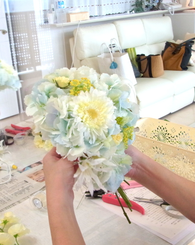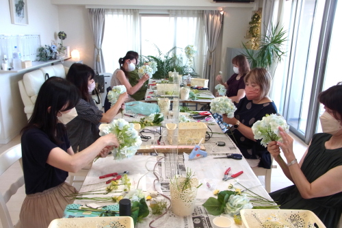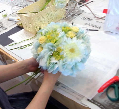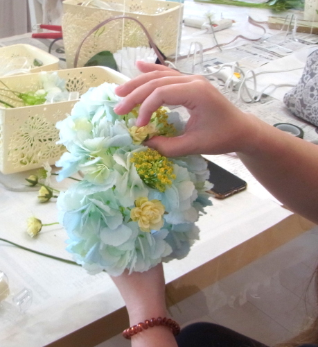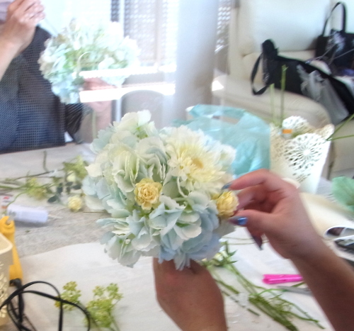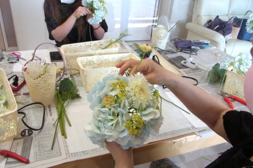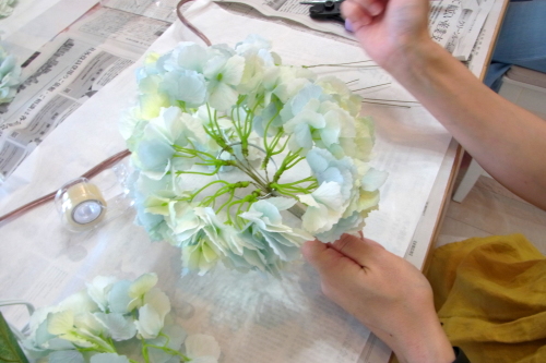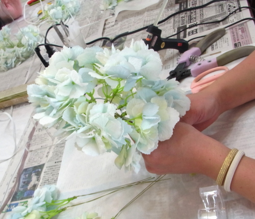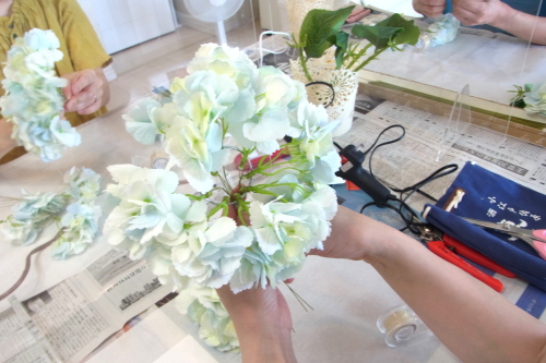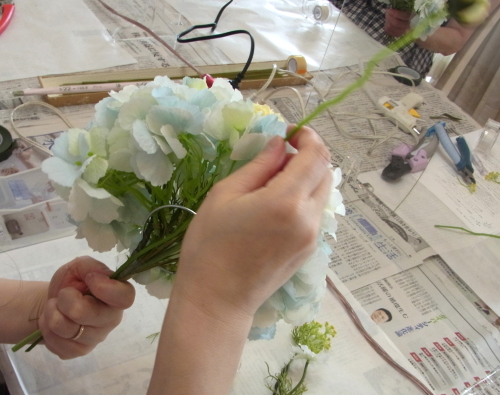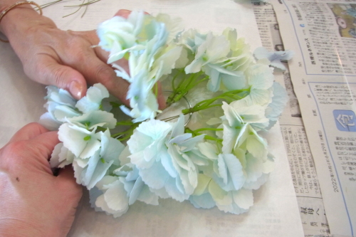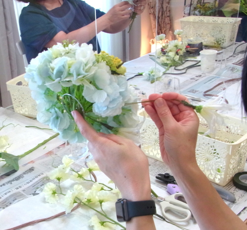 | トップがはいったら、残りの3輪で空間をふわっと埋めます。 これから花材がはいりますので、この時点では、全部がうまらなくても大丈夫ですよ 紫陽花の魅力が生きる、ふわっと感、透け感を大切にしましょう |