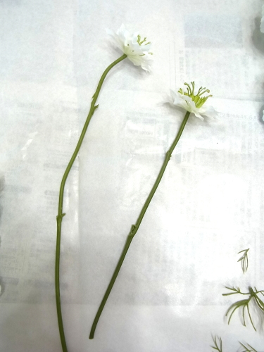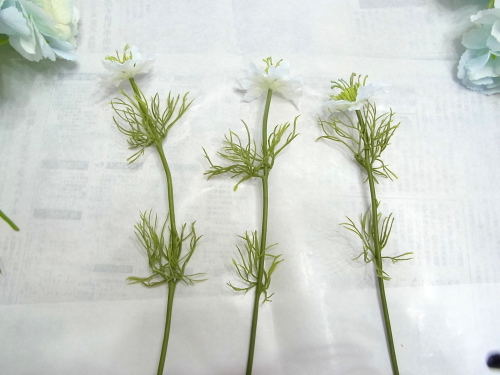 | 花材の準備をします、 ニゲラを小分けにします。 すべての花材に共通事項です、魔法のアシストリングにとめても、上下できるよう 茎についている、�葉やでているとげとげしているものはカットしておきましょう。 |