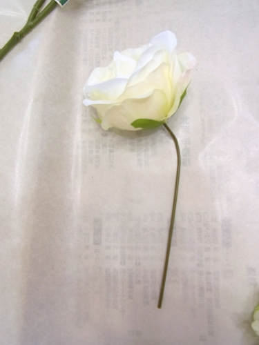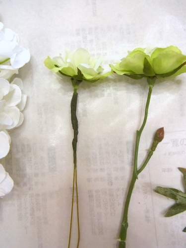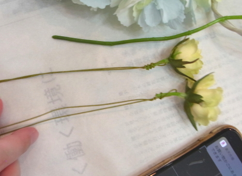 | ディルフラワーもワイヤリング、テーピングします。 ディルフラワーのワイヤリングは下の方にします 目的は茎延長のためのワイヤリグです。 カーブさせる場合はディルフラワー自体の茎で曲げられます。 そのほうがとてもきれいに見えます。 ミニバラは最初からワイヤ―通っていませんでした。このワイヤリングは花の額下からします。目的は曲げられるようにするためのワイヤリング。 ポイント アーティフィシャルフラワーを扱うときは、もともとの茎にワイヤーがはいっているかどうか?これはまげられるのか?を必ずチェックしましょう 曲げられるものに、わざわざみえるようにワイリングする必要はありませんよね、テーピングはみえないことにこしたことはないので。なんのためのワイヤリングか、目的をもって使いこなしましょう |