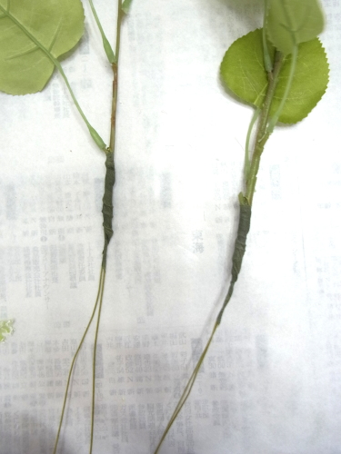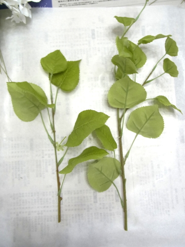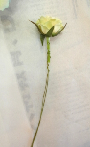 | ミニバラの束をひもとき、この花材はワイヤーが通っていません。 (束の中に�葉っぱだけのものがありますが、それは仕様です、花取れではありません) そのうち2輪程度をワイヤリングします テーピングはワイヤリングをねじかけたところだけにします。 ワイヤー全部には巻く必要はありません 上下がスムーズにできないうえ、束が太くなってしまうので。 |