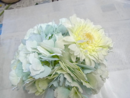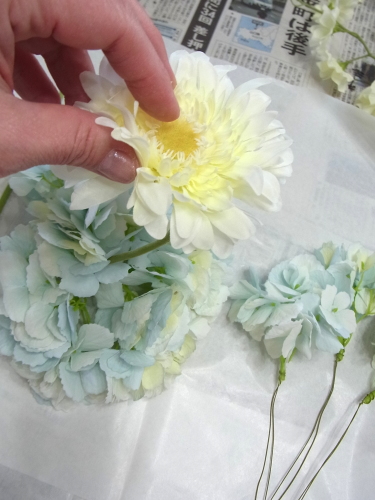 | さぁ!いよいよ 準備したお花たちを紫陽花の好きな位置に挿して、とめいきます。 いずれもリングに通して、持ち手にテープでとめるだけです。 まず、大振りのメインのガーベラから。 |