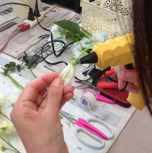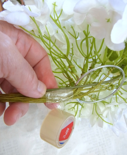 | 持ち手にセロテープでとめます。 ガーベラの茎は長いので、ワイヤリングした紫陽花たちと同じくらいに、短くカットしておきましょう! |