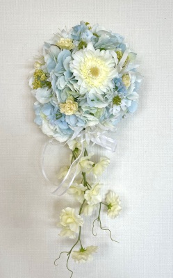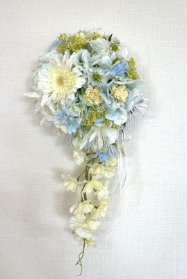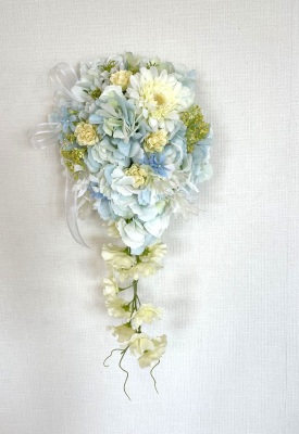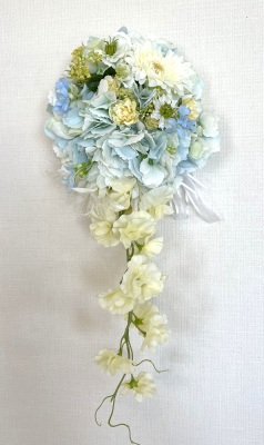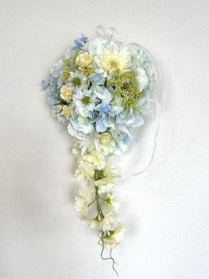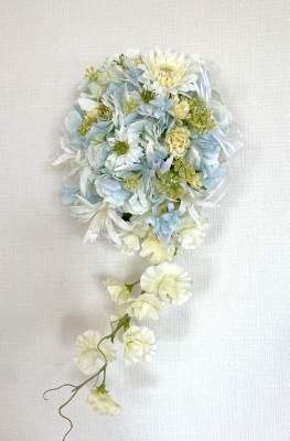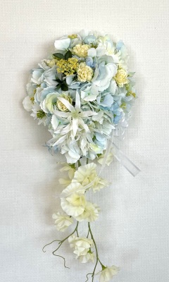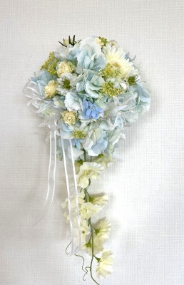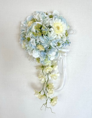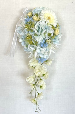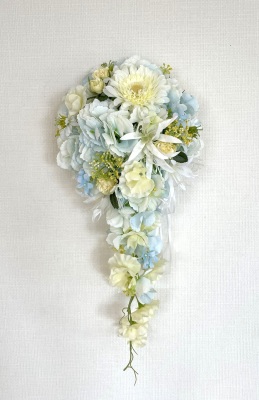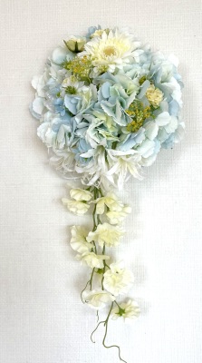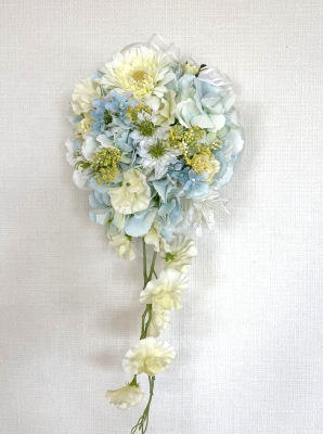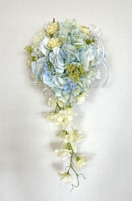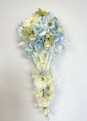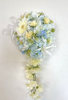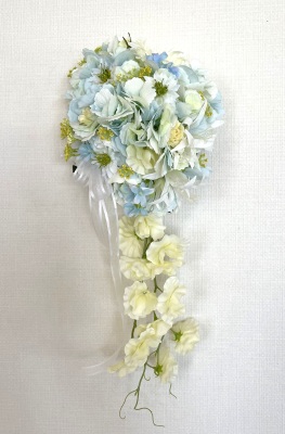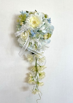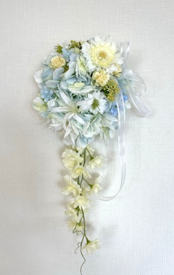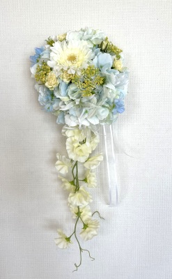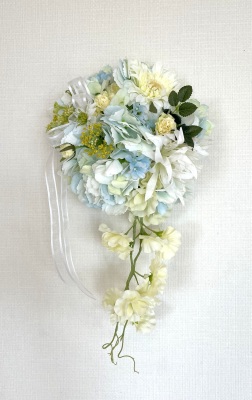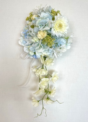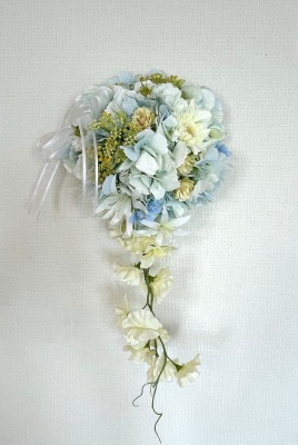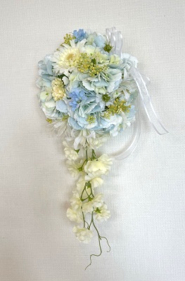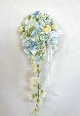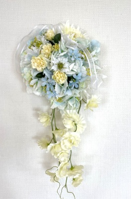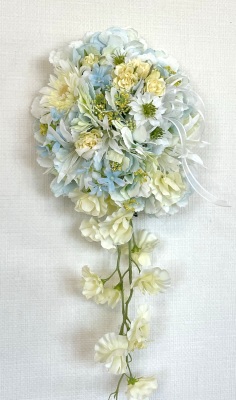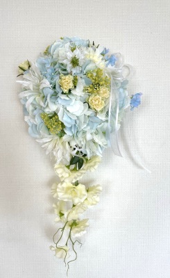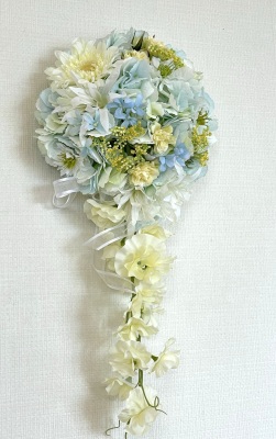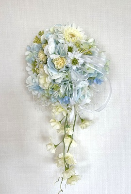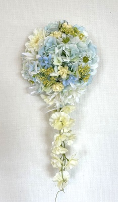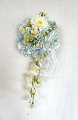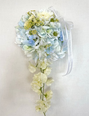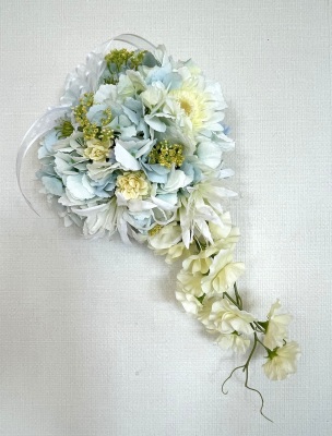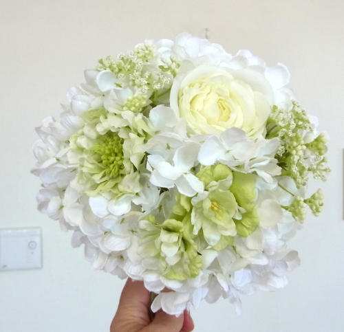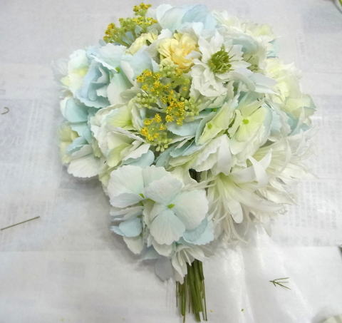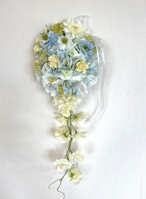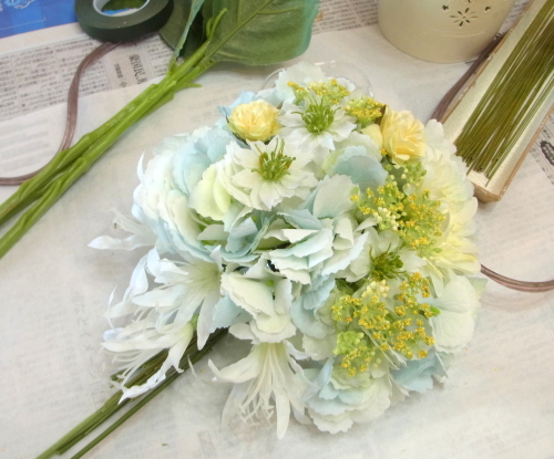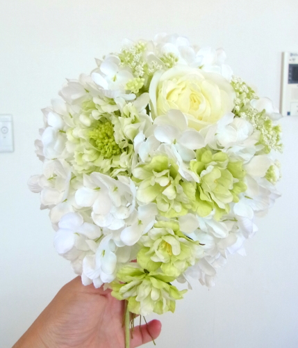 | 先端はカバーできましたので、後はリボンでグルーで付けながら、ぐるぐると持ち手に巻き上げてセロテープ部分をを隠して完成です。 お好みでミニバラの葉をグルーでトッピングしてもOK。シルエットが欠けているところは、紫陽花など、花材を動かして整えましょう。 ワイヤリングしてあるので、自在に動かせます。 |