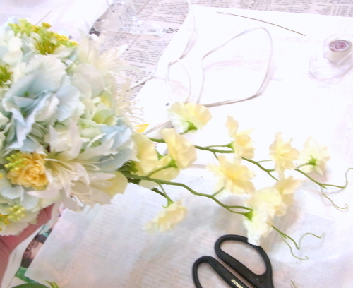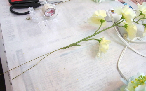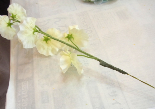 | 全体をみえるようにして、2本のスイトピーを絡めてひとつにします。 | |