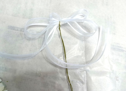 | リボンを24番のワイヤーでつくります。 22番と区別するために、みなさんのお手元には24番は白いワイヤーをおいれしています。 |