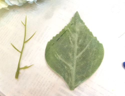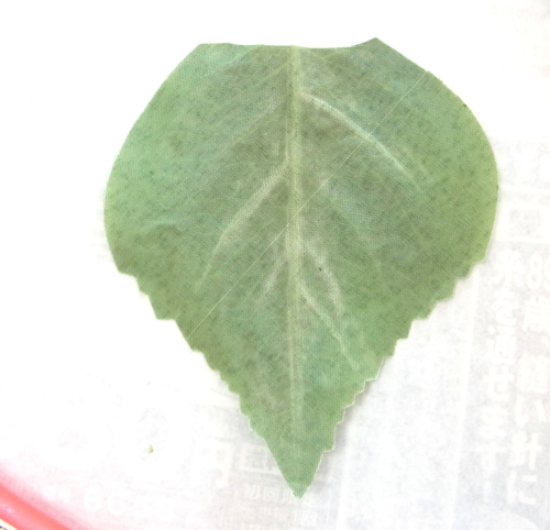| 持ち手の処理をしましょう。紫陽花の葉で葉っぱシールをつくります。 葉っぱシールとは、私が名付けたものですが、これほど、自然に綺麗にかくしてくれるものは他にないでしょう。なんたって葉っぱですから。 ぜひみなさんもつかってみてくださいね。写真のように骨抜きにして、ペロンペロンにします。 先端をこのようにカットしておきます |