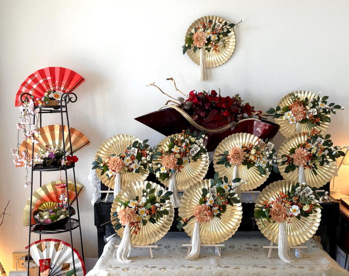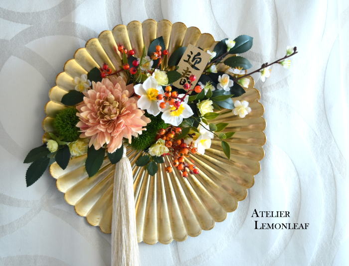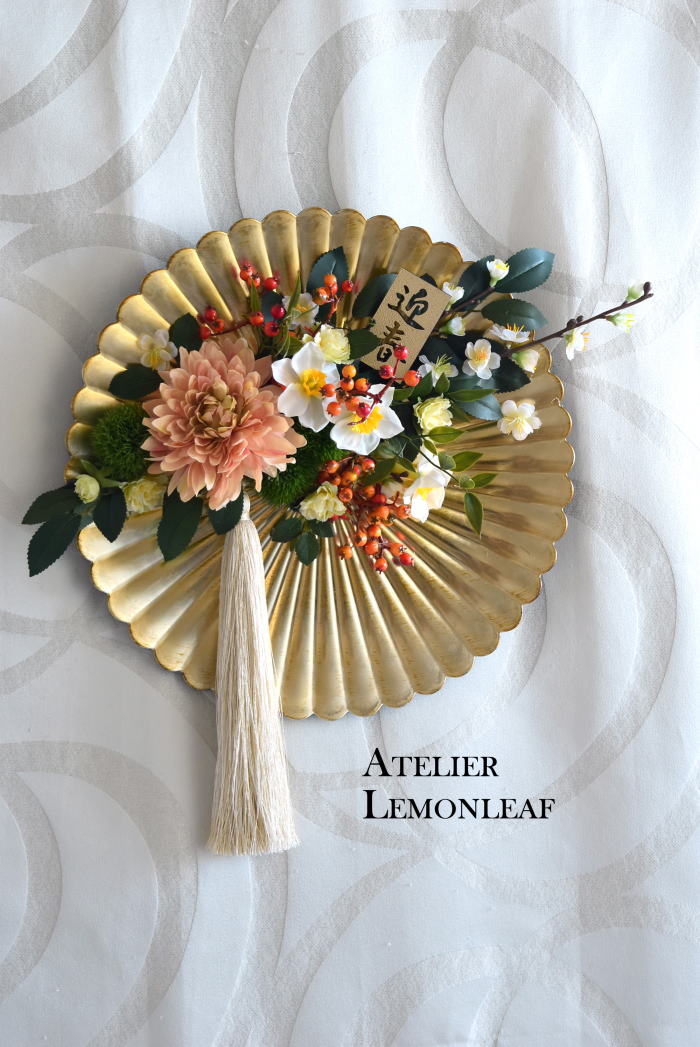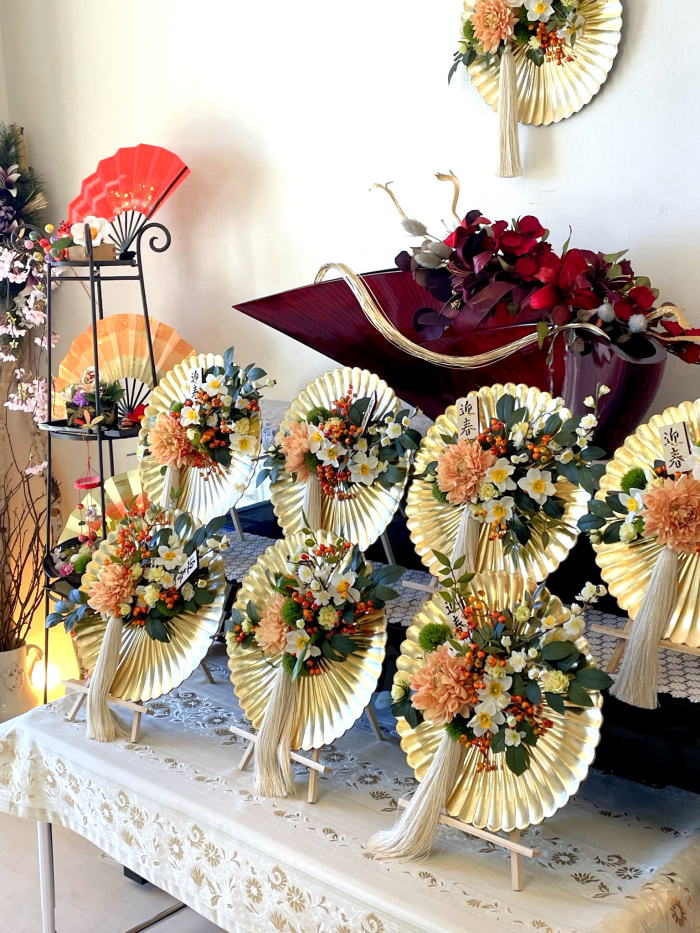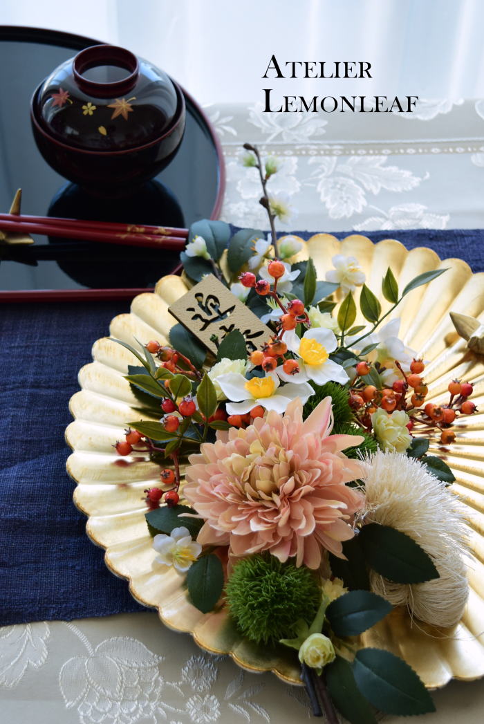 | 榊の葉を 好みの位置で貼り付けます。 榊の葉がクロスしていたらどちらかをカットして、1本1本のラインを生かしましょう。 カットした榊の葉は後で使います 茎の方も接地している場所をしっかり 見極めて お皿にグルーで固定します 数か所でプレートに花束を固定します。 とてもよくつくので、グルーだけで固定できてしまいます。 ポイント なにもかも、プレートに押し付けて貼ると、べったりとしたアレンジになりますので、要所、要所でかまいません ナチュラルに、フンワリと作りましょう |