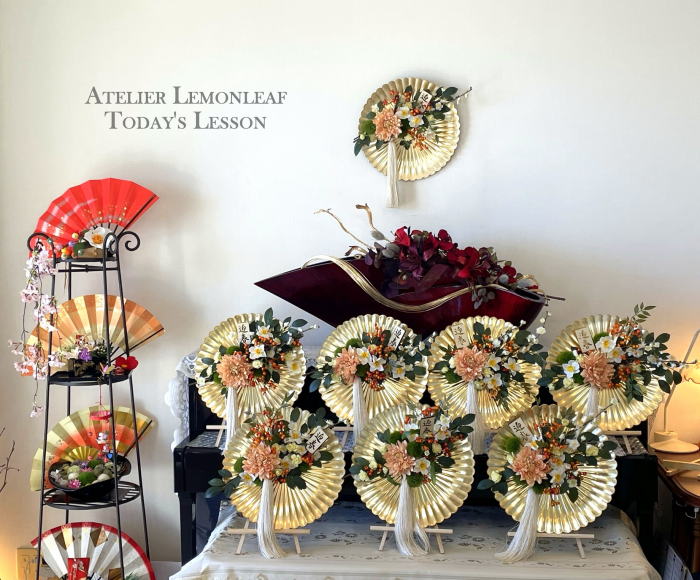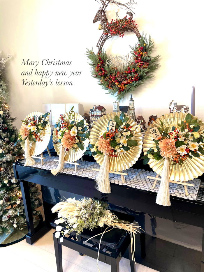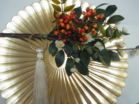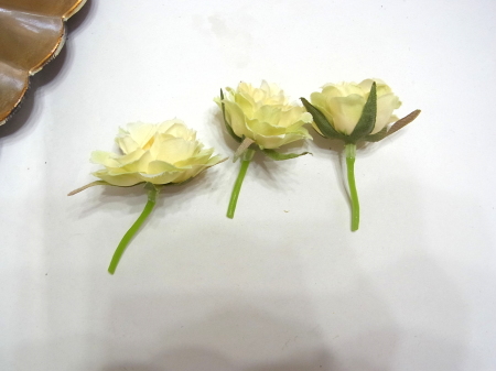 | こんにちは 年末乃お忙しいなか、特別レッスンにご参加くださりありがとうございます。 美しいゴールドプレートに新春を描きましょう! まずマムの茎をカットしましょう、マムの茎は3センチ程度つけておきます マムの葉っぱは仕上げで、必要に応じて使います グリーントリュフは茎をはずします 榊は小枝がクロスしているものはカット、一本、一本のラインを生かしましょう カットした榊はあとで使います |