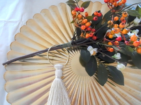 からまっている南天を開きましょう 南天の重そうな部分、ごちゃごちゃしている部分は奥の方でカットして間引きます。 梅、榊、南天を、セロテープまたはフラワーテープお好みのレイアウトで写真のような花束をつくります。 レイアウトが決定したら、持ち手の上のほう、一か所でしっかりフラワーテープかセロテープをきつく巻きます |